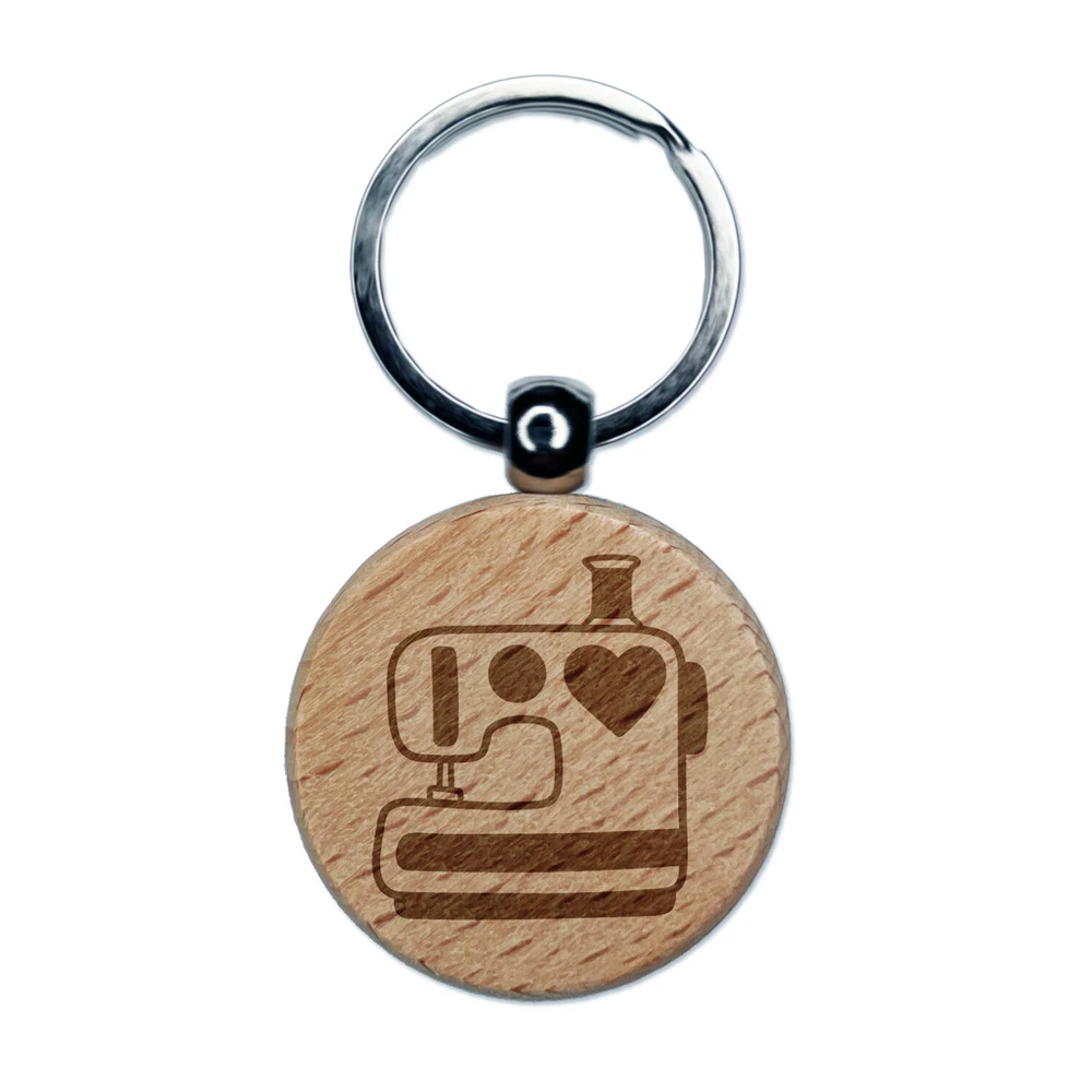 Sewing Machine with Heart Engraved Wood Round Keychain Tag Charm