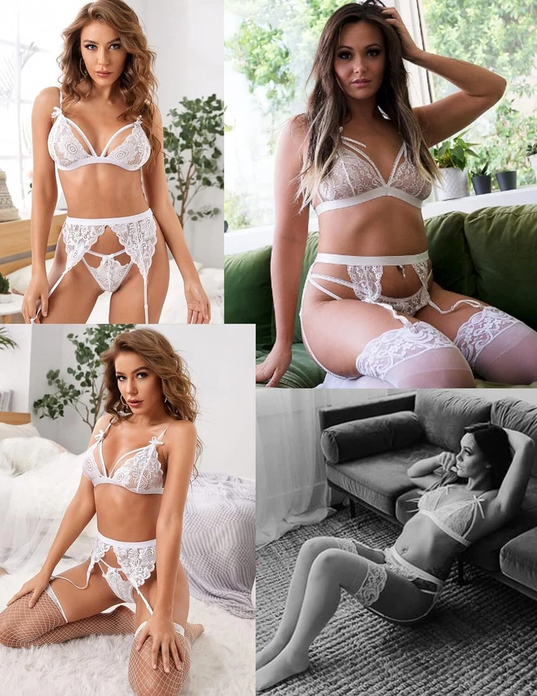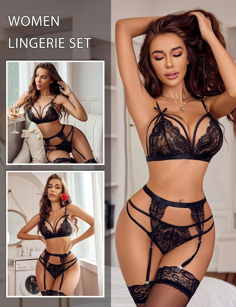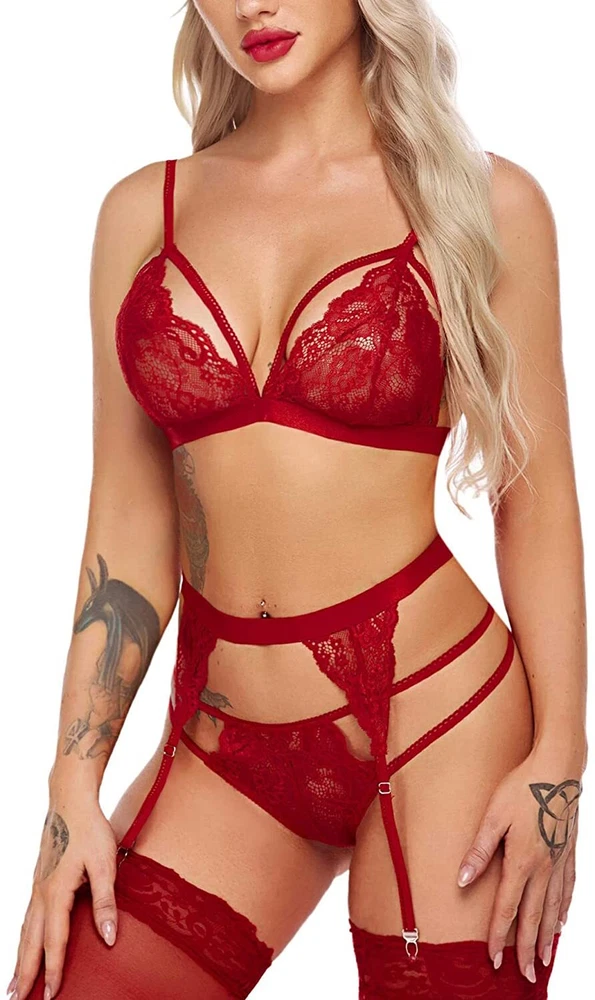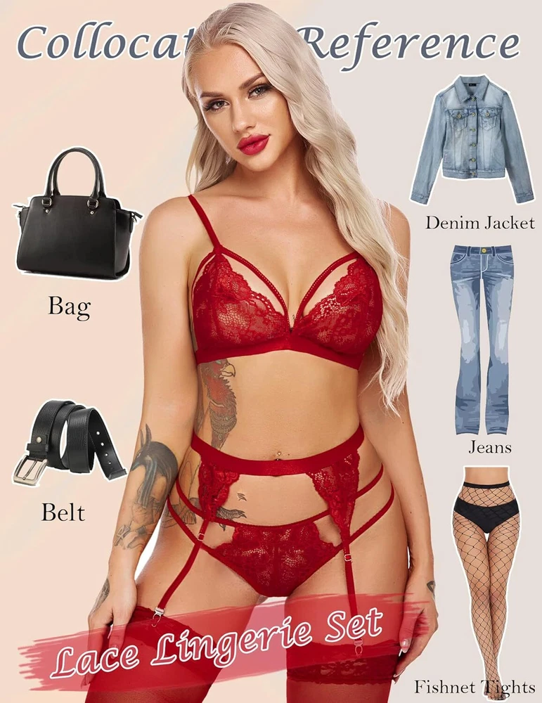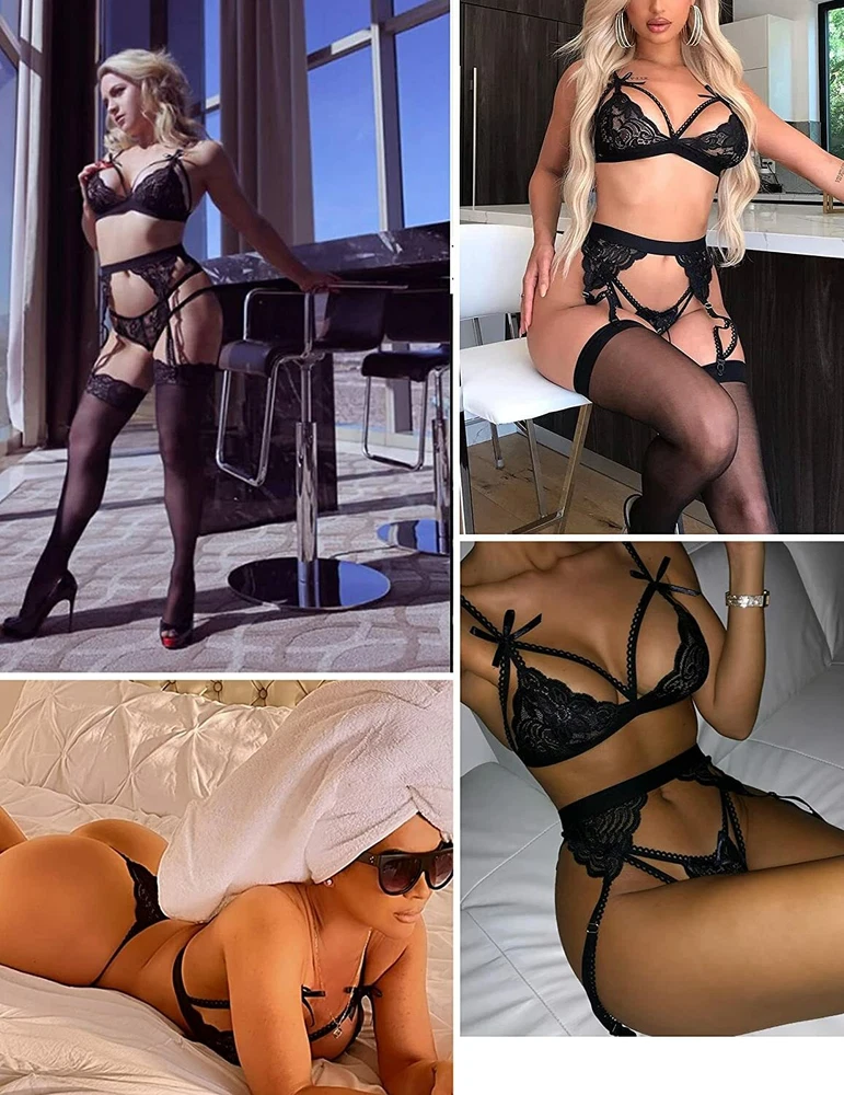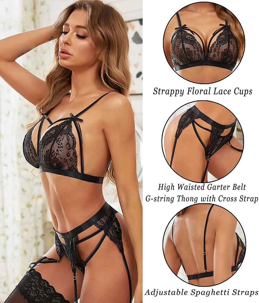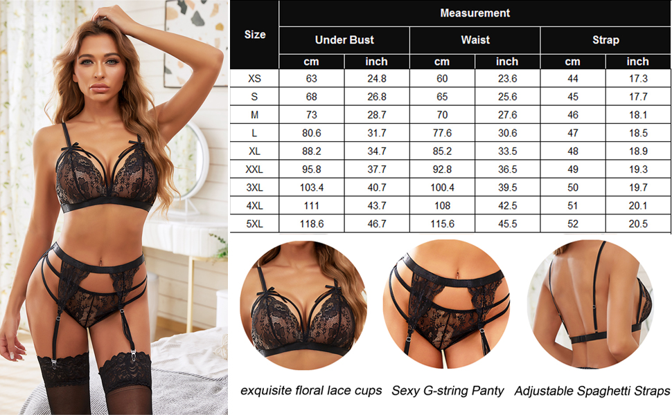 Materia l : L ace Women lace lingerie set features sheer lace cups with strappy detail, satin bow accents, adjustable spaghetti straps, a hook back closure, a matching high waisted garter belt with adjustable garter straps. Style: Garter belt set, garter lingerie, two piece bodysuit, women in lingerie, lacy garter set, lingerie for women, sexy lingerie set, bra & panty sets. The lace on the front and the back is absolutely gorgeous,perfectly show your elegant figure. This seductive lingerie sets features sheer lace cups with strappy detailing, satin bow accents, adjustable spaghetti straps, a hook back closure, a matching high waisted garter belt, adjustable garter straps with metal clips, and a matching G-string panty. Occasion: This chemise with garters can be used as valentine's lingerie, lingerie set, sleepwear, honeymoon lingerie for women, bridal lingerie set, babydoll lingerie, V-Day Lingerie for women. Wear it and Surprise your sweetie on valentines day, Honeymoon, Anniversary and every special moments. Package Content: 1 x Women Lace Babyboll with Garter Belts Panty (Thigh highs/Stockings not included.)
