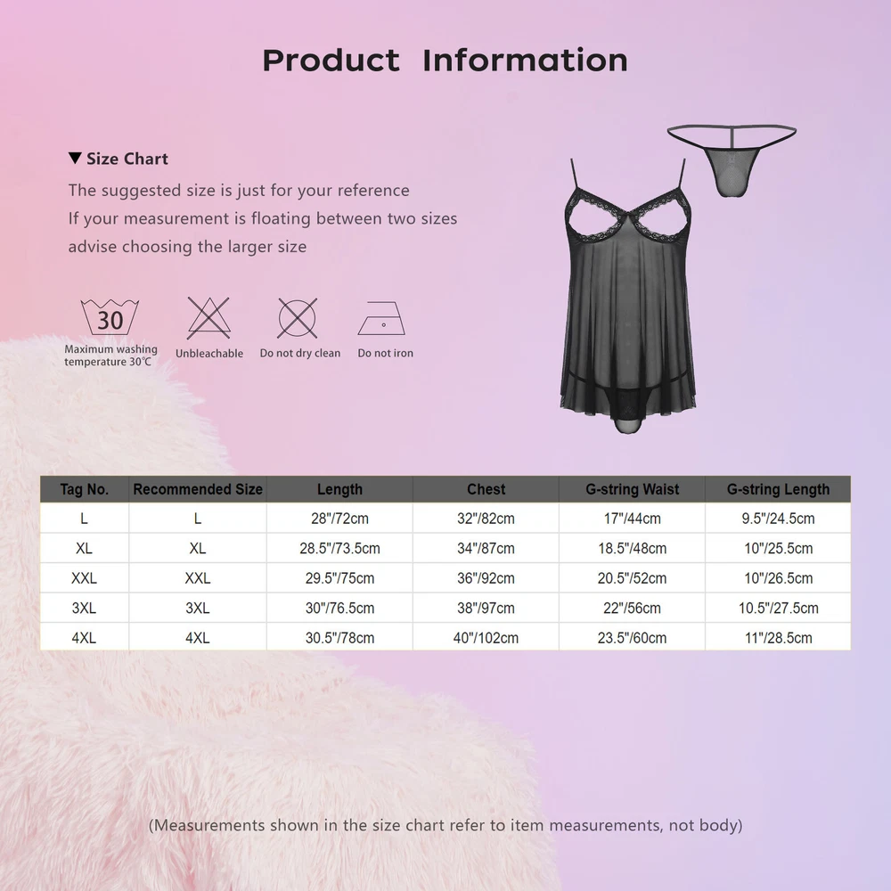 Click Here to New Arrivals New Arrivals Boys Clothing Girls Clothing Women's Clothing Men's Clothing Baby Clothing Women Mesh Lingerie Fishnet Mini Dress Hollow Out Babydoll Bodycon Nightwear Price for all: 4.69 Buy It Now Sexy Women's Halterneck Micro Thong Shiny Metallic Bikini Lingerie Set Swimwear Set Include : 1x Dress, 1x G-string Condition : New without tag Material : 90% Mesh, 10% Lace Features : Mens Sheer Mesh Lingerie Set Lace Trim Open Breast Babydolls Dress with G-string. Soft fabric, breathable, skin-friendly, comfy to touch and wear, makes you feeling well. Open breast with lace trim, sheer mesh design, make you more attractive to your lover. Adjustable spaghetti Straps for better fit, mini length dress, matching a low rise G-string. Suitable for Valentine’s Day gift, anniversary, honeymoon, wedding night, date night. Size Chart : The suggested size is just for your reference. If your measurement is floating between two sizes, advise choosing the larger size. (Measurements shown in the size chart refer to item measurements, not body) Tag No. Recommended Size Length Chest G-string Waist G-string Length L L 28"/72cm 32"/82cm 17"/44cm 9.5"/24.5cm XL XL 28.5"/73.5cm 34"/87cm 18.5"/48cm 10"/25.5cm XXL XXL 29.5"/75cm 36"/92cm 20.5"/52cm 10"/26.5cm 3XL 3XL 30"/76.5cm 38"/97cm 22"/56cm 10.5"/27.5cm 4XL 4XL 30.5"/78cm 40"/102cm 23.5"/60cm 11"/28.5cm Friendly Tips: The size is measured by hands, please allow 1-3cm errors of measurement. Photo color might be a little different from the actual product due to color display of different monitors. Product names are trademarks of the listed manufacturer or other owners, and are not trademarks of riveronline. The manufacturer does not necessarily endorse use of these products. Payment Methods Terms and Conditions Shipping Combined shipping is limited only to the items listed under this seller account : terknowe All the free shipping item don't offer discount. We REDUCE US$1.00 on shipping cost for each additional item. Please contact us to send you the update invoice once you finish your purchase. Please note that only the item in same currency can be combined.Please note that we do NOT offer shipping discount for bidding orders or item value less than $5.00 International Orders: The buyer is responsible for any applicable import duties and local taxes. Please verify with your customs before making your purchase. Please verify your address during checkout. We are not responsible for any wrong or undeliverable addresses. Your item will be sent to your ebay address. Please make sure your ebay address is correct. Any non- received items caused by invalid address are not in our full refund or replacement policy. All items will be shipped within 1 business day after full payment is received. It takes about 10-20 days to US UK AU DE; about 20-35 days to other countries.Shipping may influenced by holidays, events and other uncertainties. We could not guarantee the arrival time. If you can't accept the shipping time, please check the extra charge with us to ship your item via express. Please check my other products below: Womens Fishnet Lingerie Set Hollow Out Babydoll Long Sleeve Crop Top Mini Skirt USD 4.74