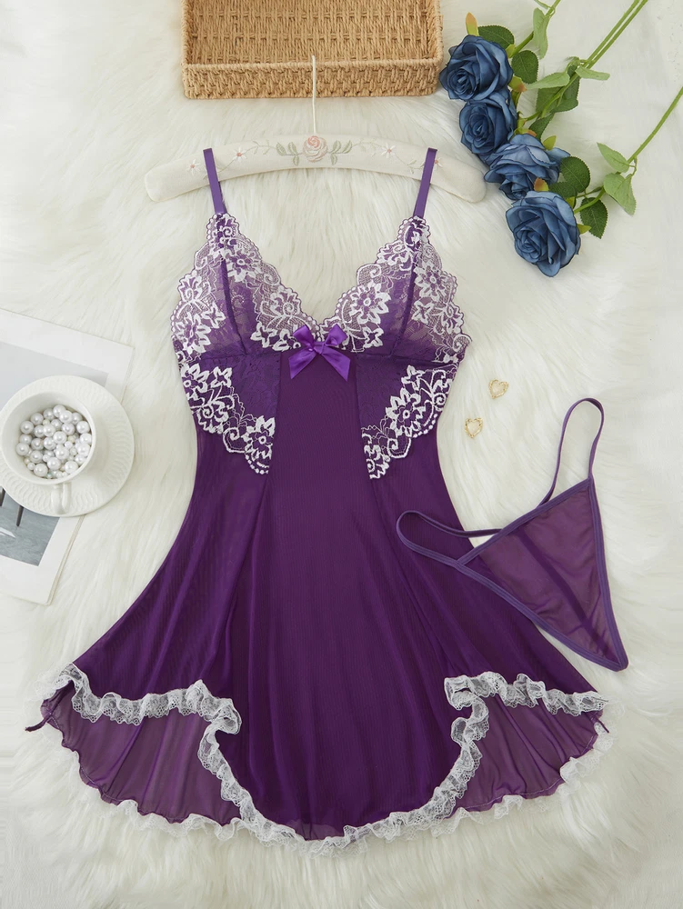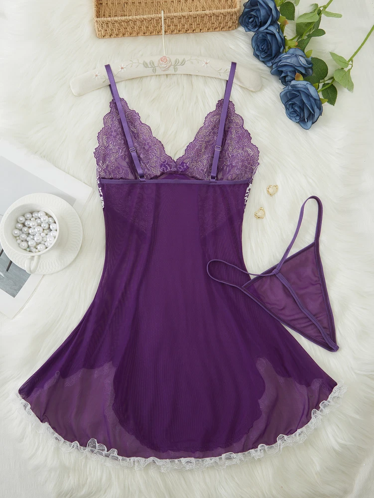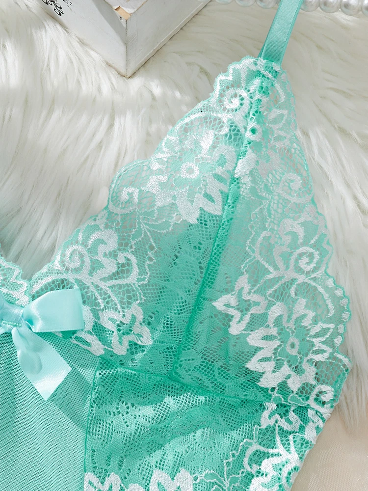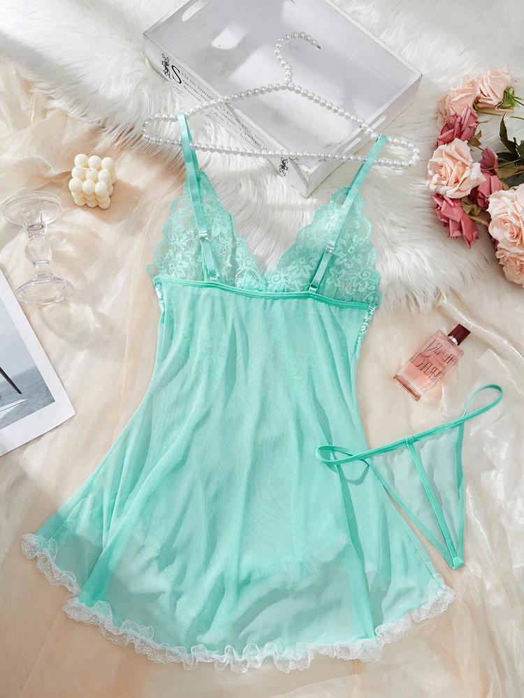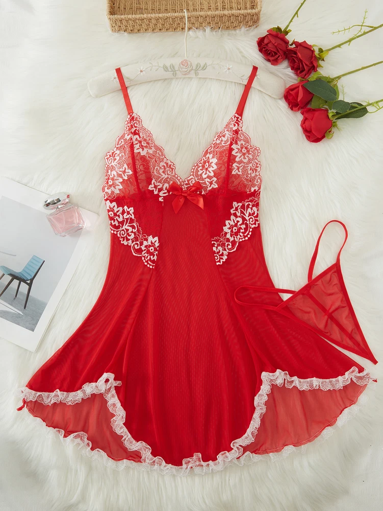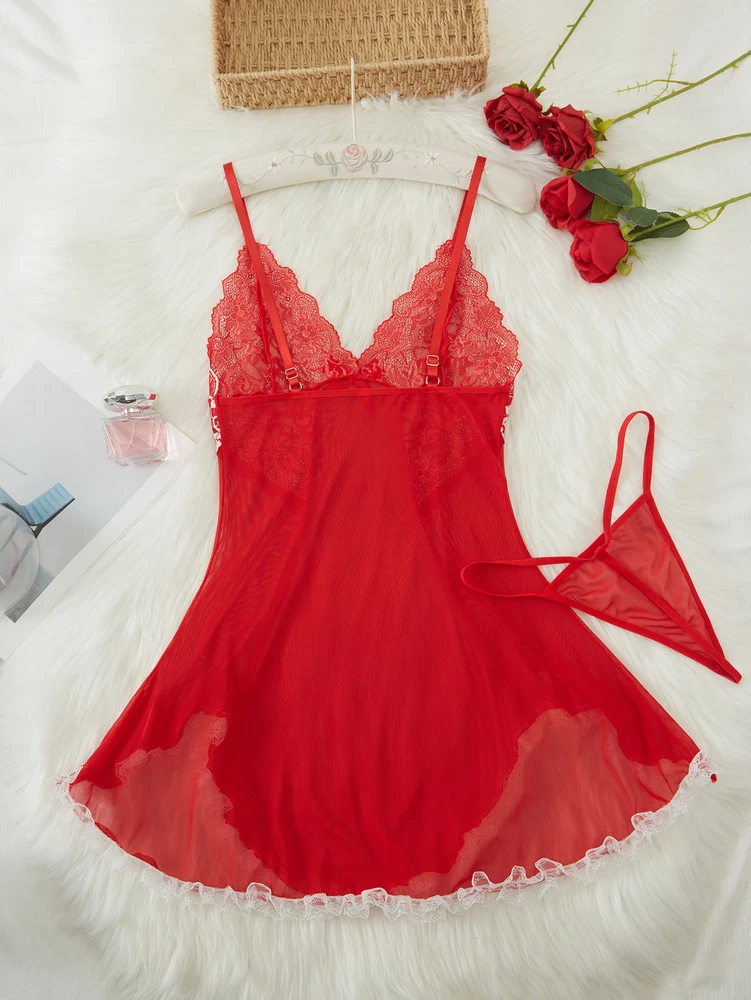 Sexy Womens Lingerie V-neck Babydoll Floral Sleepwear Lace Sheer Slip Dress Set