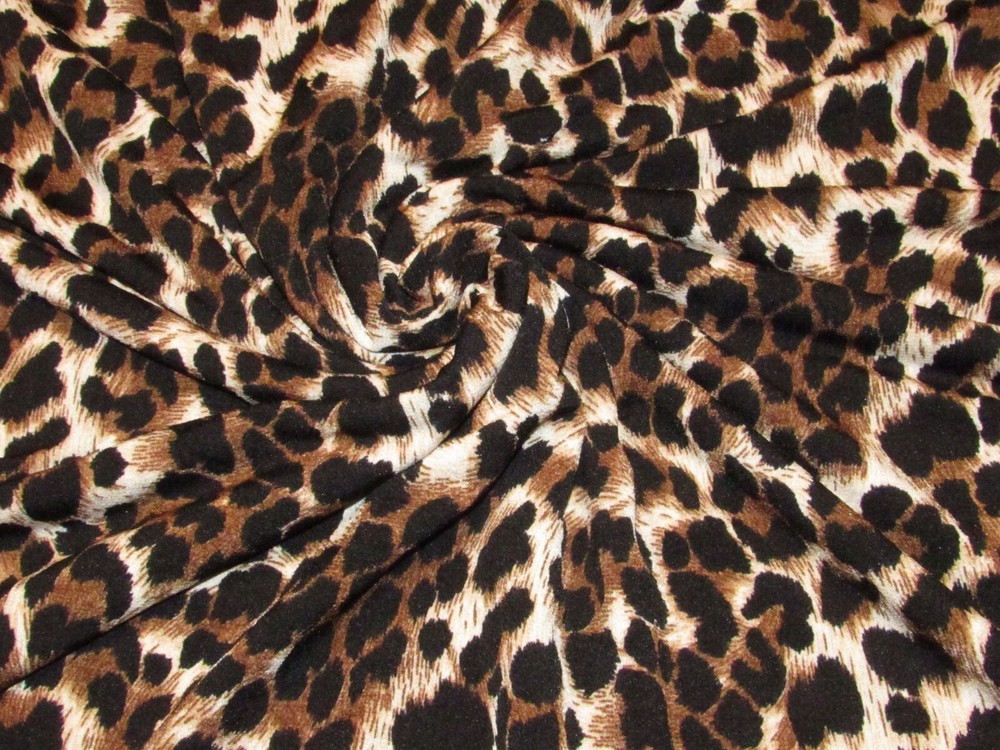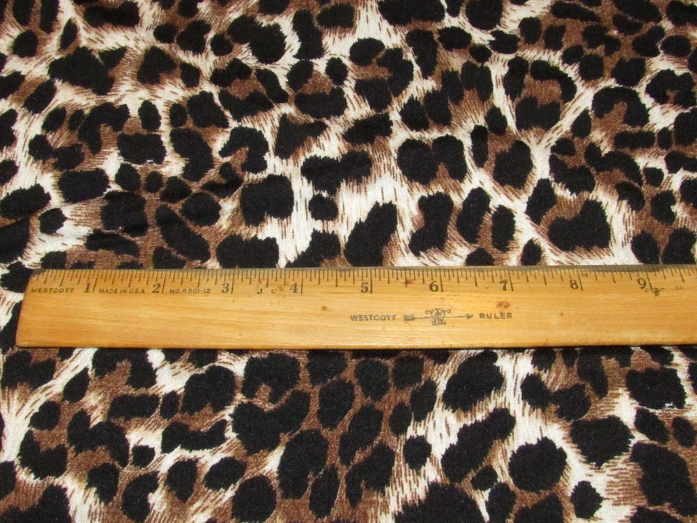 This listing features a sexy leopard print knit fabric. The fabric has a drapey, crepe texture with 4-way stretch and measures 62 inches wide. It comes in a length of 2 3/4 yards, making it suitable for various craft projects like clothing, accessories, or home decor with an animal print theme. PLEASE ask any questions before bidding. Sold As-is.