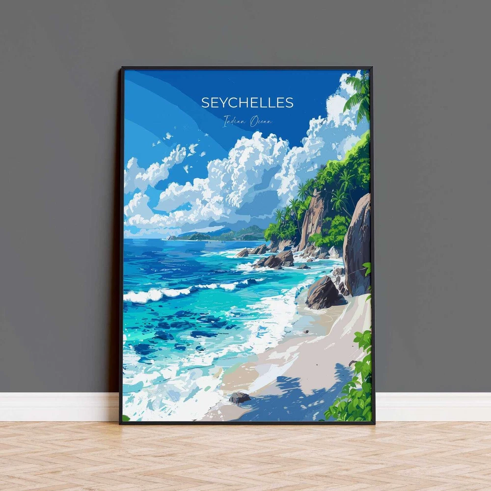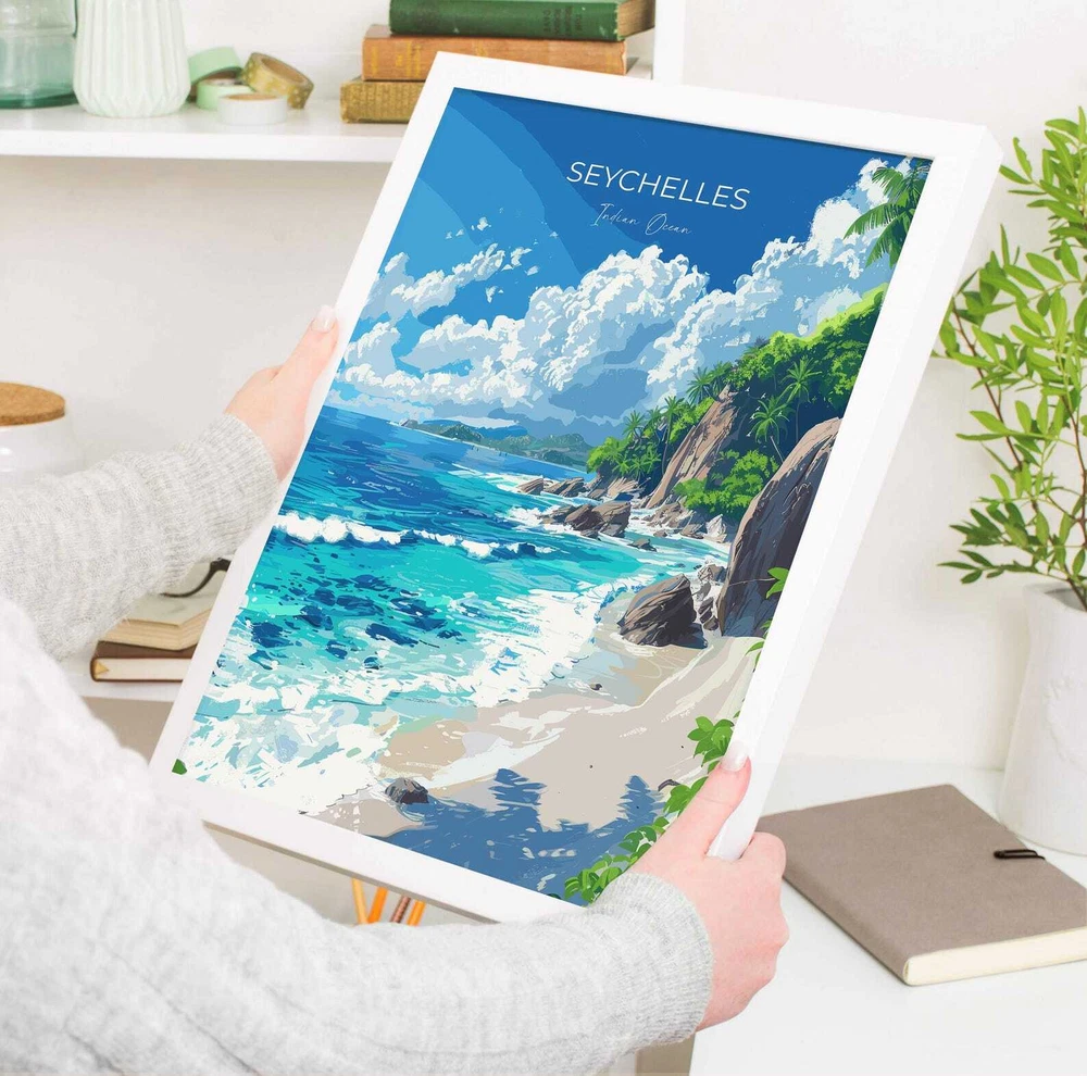Seychelles Travel Poster Wall Art Travel Print Of Seychelles Indian Ocean Seychelles Islands Art Lovers Gift Material: Premium luster photo paper Print type: Inkjet printing One side printed + The finish provides the highest possible resolution and color saturation + Lasts up to 200 years in color and 400 years in black-and-white + Printed on high-quality resin-coated photo base paper medium + Posters can be hung with double-sided tape, tacks, or framed + Hand washing with a gentle cry cloth is recommended for extended durability I will hand select the best choice of paper for your chosen design to ensure top quality results for a beautiful, bright and luxurious print. All prints are sealed in cellophane slips for protection during transportation, and are shipped in a protective cardboard envelope.