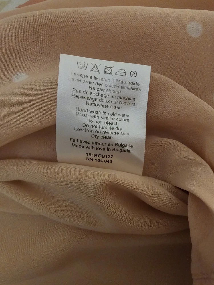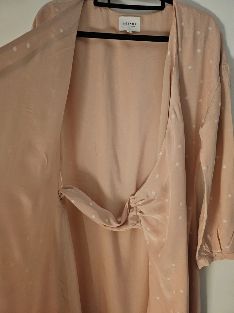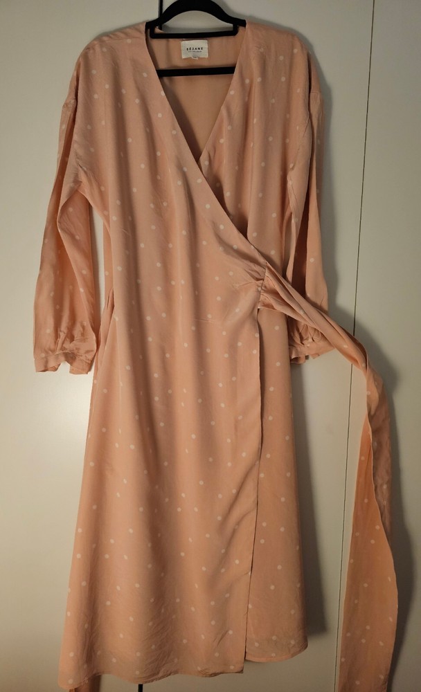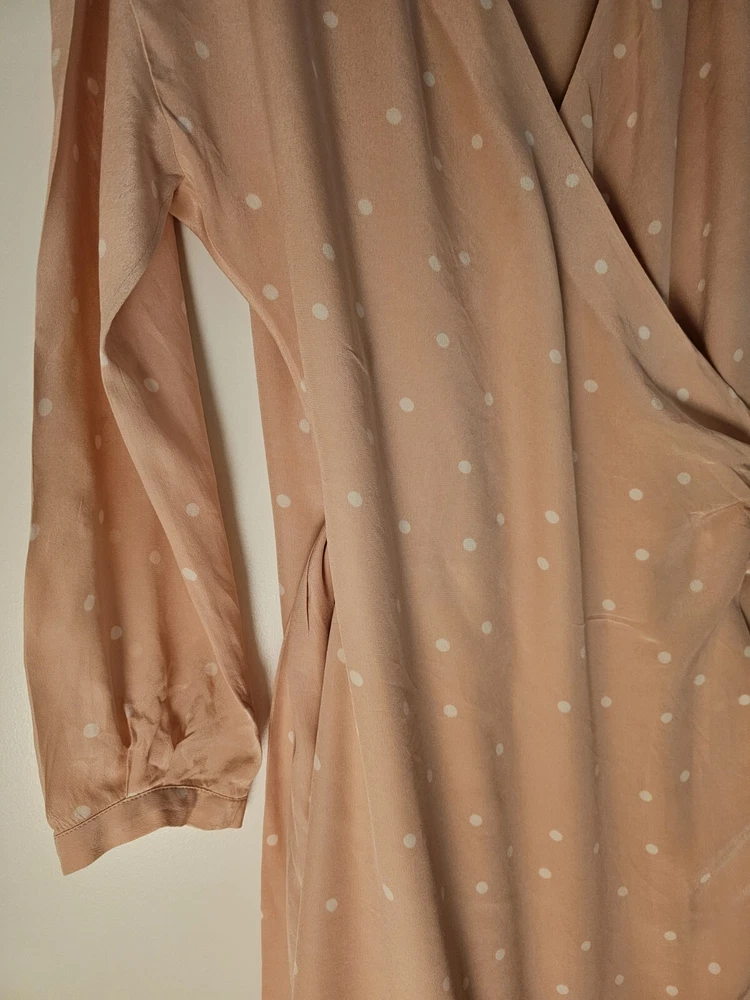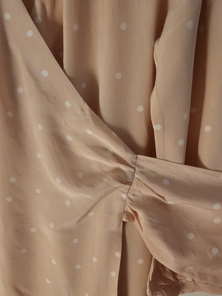 Pre-Owned. Gently used. Only used for ocassions so far but can be worn on any day. Lovely sweet peachy pink base colour with white polka dots. Midi length on me (I'm about 165cm tall). I usually wear AU/UK10 in clothes and this fits ok. - Size 38 - 100% silk - slit and button detail on sleeves - lined