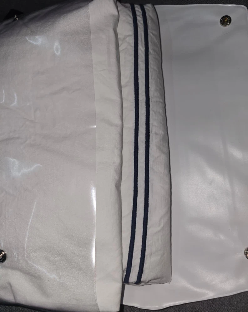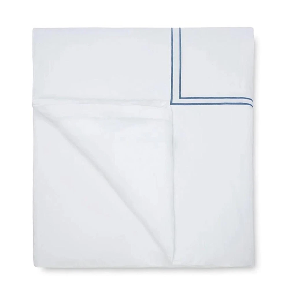 The Sferra Estate Full/Queen Duvet White/Navy Applique Stripe Cover is a luxurious and stylish addition to any bedroom. Made in Italy from 100% Italian spun long staple cotton percale, this duvet cover features a sateen applique navy blue stripe pattern on a white background. It has a transitional style with a plain hem and end ties, adding a touch of elegance to the design. With a thread count of 201-400 and 3 extra buttons for closure, this duvet cover is both machine washable and reversible, making it a versatile and high-quality choice for adults.