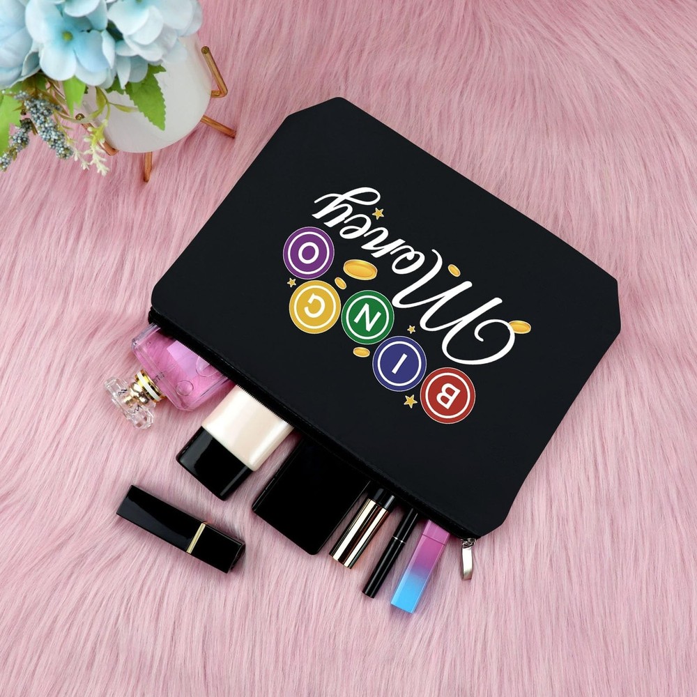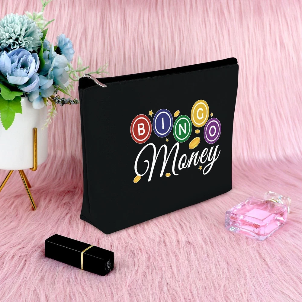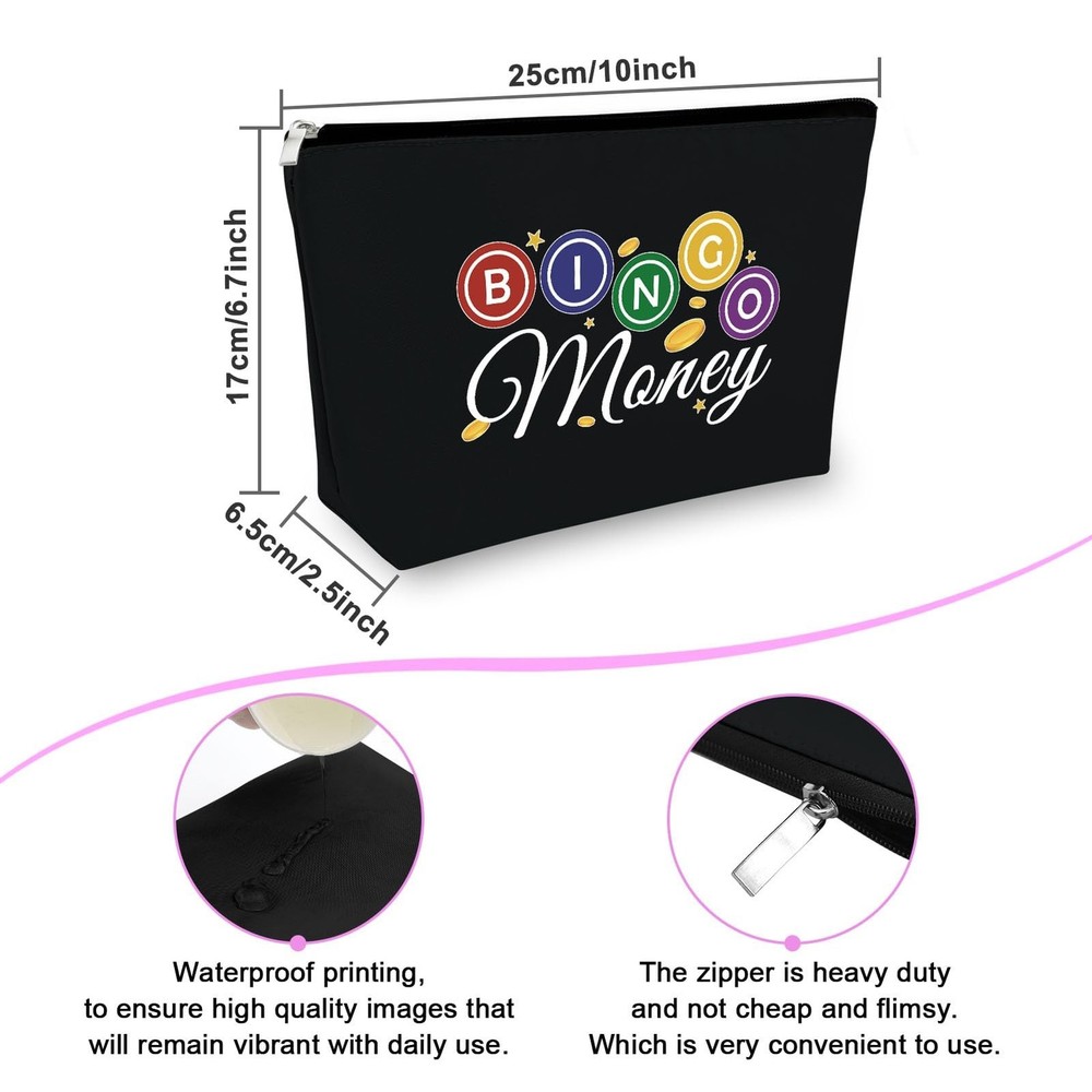 Sfodiary Bingo Game Lover Gift Bingo Money Makeup Bag Casino Lovers Gift for Women Cosmetic Bag Casino Gambling Player Birthday Christmas for Gambling Lover Travel Cosmetic Pouch(Black) Product Details Color: Black-Bingo Lover Gifts Makeup Bag Brand: Sfodiary MPN: Does not apply UPC: Does not apply EAN: Does not apply Product Dimensions: 9.84 x 6.69 x 0.32 inches Item Weight: 1.44 ounces Department: Women Makeup Bag for PurseDouble-sided printed, high quality coating, to ensure high quality images that will remain vibrant with daily use.This Cosmetic Bag is made of oxford cloth, the material makes the makeup bags practical and durable for daily use, lightweight and easy to carry, reusable and long-lasting.it's easy to clean, it can be washed by hand wash.Perfect travel accessories for women! Bingo Player Birthday GiftThis Bingo Queen cosmetic bag is perfect for gamer birthday gift, Christmas gift, Valentine's Day gift, Mother's Day gift, New Year's gift, Baptism gift, Anniversary gift or just because. Multifunctional Cosmetic BagProper size and space, the good friend makeup bags measure approx 10 x 6.7 inches / 25 x 17 cm, which has plenty of storage space to store your lots of cosmetics.Can store your cosmetics easily, such as makeup brushes, mascara, lipstick, wipes and so on.Smooth zipper in vantage appearance, tight to protect items in, it can ensure your items not easy to fall off.It's a perfect travel bags for Women.THIS ITEM IS NOT INTENDED FOR USE BY CHILDREN 12 AND UNDER.