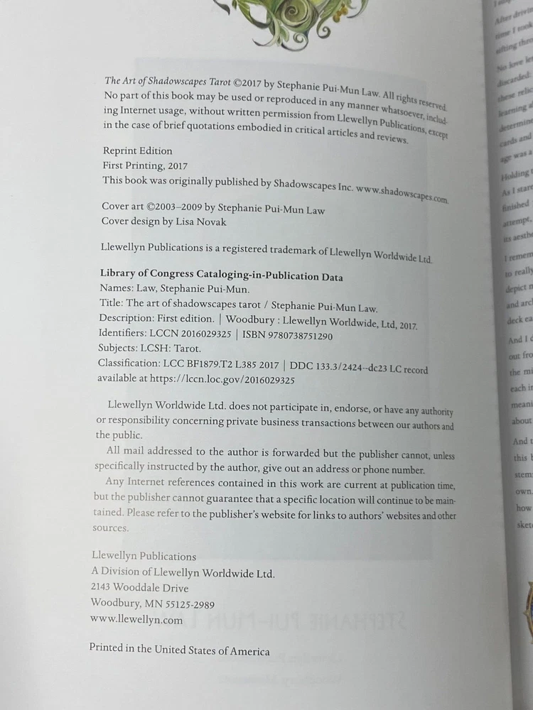 TitleLeading:TheAuthor:Stephanie Pui-Mun LawBook Title:Art of Shadowscapes TarotNumber of Pages:96 PagesItem Height:0.2 inIllustrator:YesDewey Edition:23Publication Year:2017LC Classification Number:BF1879.T2L385 2017Genre:Body, Mind & SpiritTopic:Divination / Tarot, Divination / GeneralDewey Decimal:133.32424ISBN-13:9780738751290Format:Trade PaperbackISBN-10:0738751294Item Length:11 inItem Width:8.5 ingtin13:9780738751290Publisher:Llewellyn Publicationsbrand:Llewellyn PublicationsIntended Audience:TradeSynopsis:Stephanie Pui-Mun Law's art expresses the spirit and beauty of the magical universe. Inspiration, intuition, and emotion come alive with each stroke of the brush, creating elegant images that speak directly to the heart and soul. Filled with full-color paintings, sketches, personal reflections, and card meanings, this companion guide to Shadowscapes Tarotprovides new insights into a groundbreaking deck that continues to redefine the possibilities of tarot., Stephanie Pui-Mun Law's art expresses the spirit and beauty of the magical universe. Inspiration, intuition, and emotion come alive with each stroke of the brush, creating elegant images that speak directly to the heart and soul. Filled with full-color paintings, sketches, personal reflections, and card meanings, this companion guide to Shadowscapes Tarot provides new insights into a groundbreaking deck that continues to redefine the possibilities of tarot.Language:EnglishLCCN:2016-029325Item Weight:12.8 Oz
