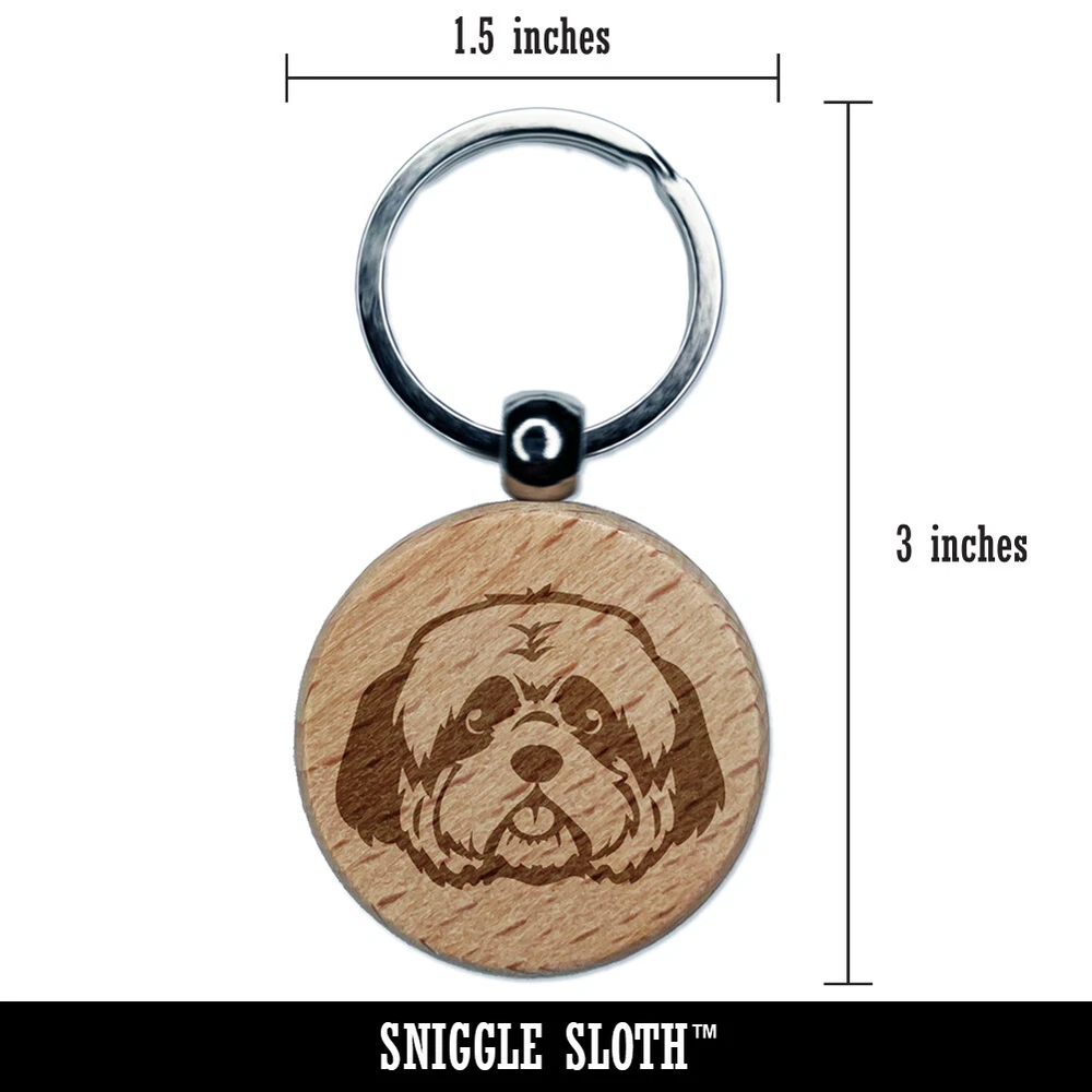 Shaggy Shih Tzu Dog Head Engraved Wood Round Keychain Tag Charm