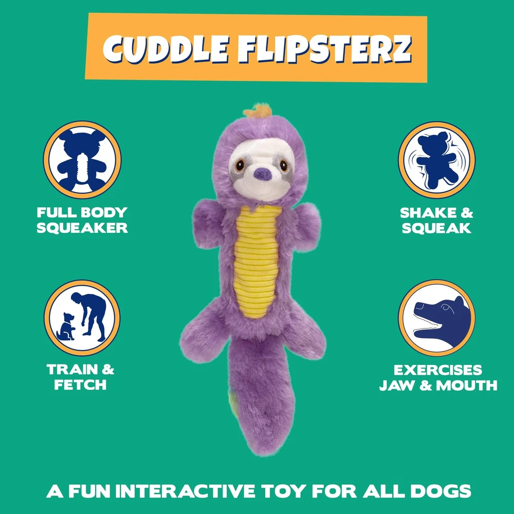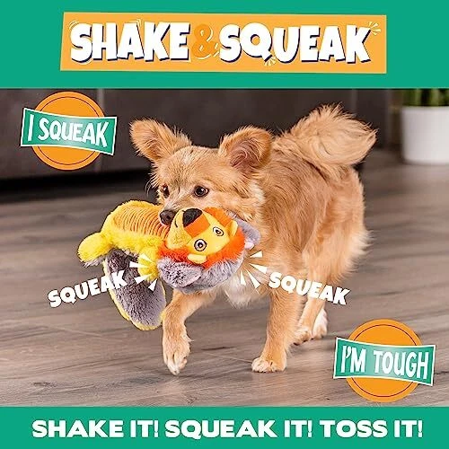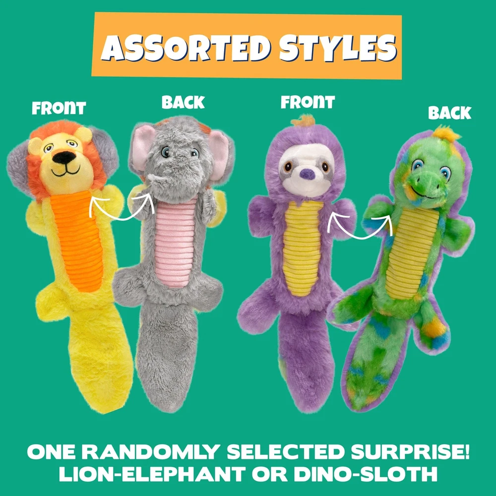 These premium plush toys come in an exciting variety of cuddly critters and colorful characters. Flipsterz are twice the fun with 2 crazy contrasting friends to flip back and forth for extra fun and excitement in your interactive play with your pet. Along with being soft to hug and fun to tug, each toy comes with a full body squeaker that’s perfect for playtimes. Disclaimer: For pets only. Pets should be supervised during use. The toy is not meant to be consumed as ingestion of any non-food item is dangerous to your pet's . If product is excessively worn, damaged, or any part becomes loose or detached, discontinue use and replace as needed. RANDOMLY SELECTED: Only dog toy is supplied, and it is randomly selected from the assortment shown; customers currently do not have the option to choose their desired toy variant FLIPPIN' FUN: Shake & Squeak Flipsterz are double-sided plush toys with contrasting animal characters to flip between for twice the fun and excitement; featuring soft textured plush fabric that dogs and puppies love to play and cuddle with BUILT-IN SQUEAKER: Designed with a full-body built-in squeaker to entice and excite your pup, satisfying their hunting instincts to keep their interest during solo or interactive play INTERACTIVE PLAY: The long plush body of the Flipsterz toys make them great for interactive play between pet and owner; games such as tug or toss are great and super fun ways to bond with your dog FUN & ENRICHMENT: The immediate auditory feedback of squeaker toys excite dogs and encourages play; they are designed to provide enrichment and stimulation, catering to natural and instinctual canine behavior to keep your pup actively entertained PRODUCT DETAILS: Assorted (Dino-Sloth OR Lion-Elephant); 14", Size RECOMMENDATIONS: Pets should be supervised during use; item should be removed if excessively worn, damaged, or any part becomes loose or detached