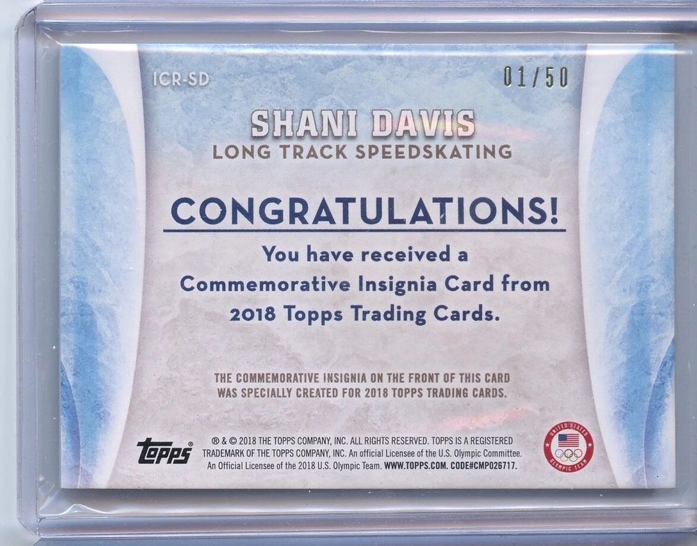 The product is a 2018 Topps U.S. Olympic & Paralympic Team and Hopefuls trading card featuring speed skater Shani Davis. This card is a parallel variety with the U.S. flag design and is part of a limited run, as it is serial numbered 1/50. As an original card manufactured by Topps, it is a sought-after item for collectors interested in Olympic sports memorabilia. This single-insert card captures a unique aspect of Shani Davis' career and participation in the Olympic games. First off the print line, 1/50 for an ebay 1/1 for some collectors!