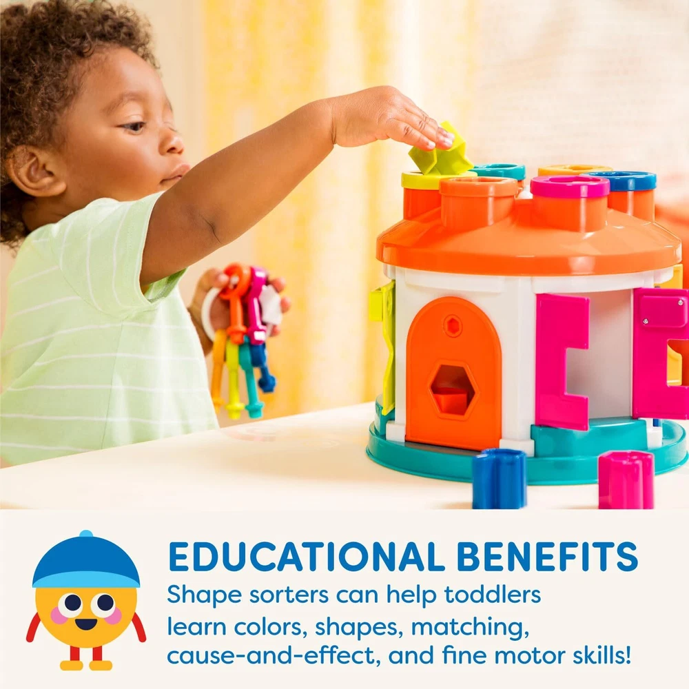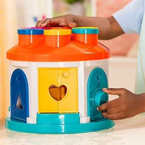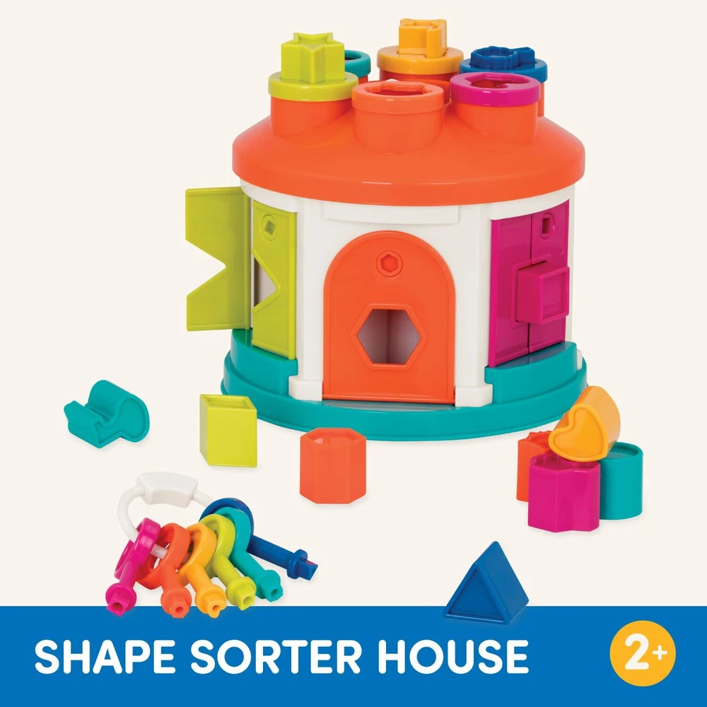 This little house is filled with big discoveries. The Shape Sorter House from is a take-along shape sorting playset that comes with 12 different shapes, a set of 6 keys and many shape and color sorting features. Shapes are easy to grab and fit and slide perfectly through a hole of the same shape somewhere around the house. Will it be on top or through a little window on the side? This is a case for your toddler to solve. Match the different shapes and see where they fit. Grab the keys, find the right one and unlock the door to see where all those shaped blocks went! Store everything directly inside the house at the hand of the day. Going somewhere? Grab the handle and it's ready to go! Watch your little one find the right door for the Kitty block, the right one for the key-shaped one, then see the big smile when he finds the right key to open the door, grab the blocks and start all over again. Build strong motor skills, and spend hours of imaginative play with this shape sorting house from . 14-Pieces shape sorting house: match the shapes of the blocks and pop them all in the house. Then unlock the doors with the bright-colored key and start all over again. Learning toy: learn colors, shapes and concepts like cause-and-effect; improve hand-eye coordination and fine motor skills. 12 different shapes: yes, there is the usual standard shapes Like the circle, the square, The Star and the triangle, but kids will also love grasping the cat, the car, The key and the heart. 6 color-coded keys: open the doors with the matching key. This keychain is easy to grasp and hold, even with tiny fingers. Rainbow colors are bright and uplifting. Tiny hands friendly: easy to unlock and open. Recommended for 2 years and up. Handy handle: Perfect for on the go. Secure all the shapes and keys inside and grab the easy-carry handle for take-along play. Safe and sturdy: this toy Shape Sorter House is made of strong and durable plastic. All of ’s toys meet or exceed the highest safety standards. Dimensions: this toddler house Playset is 9” (L) x 9” (W) x 9" (H). Trustworthy: a family-owned company, established in 1897.