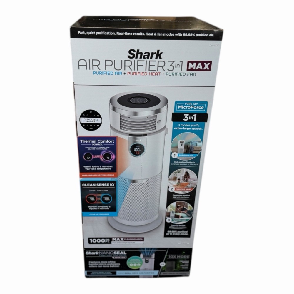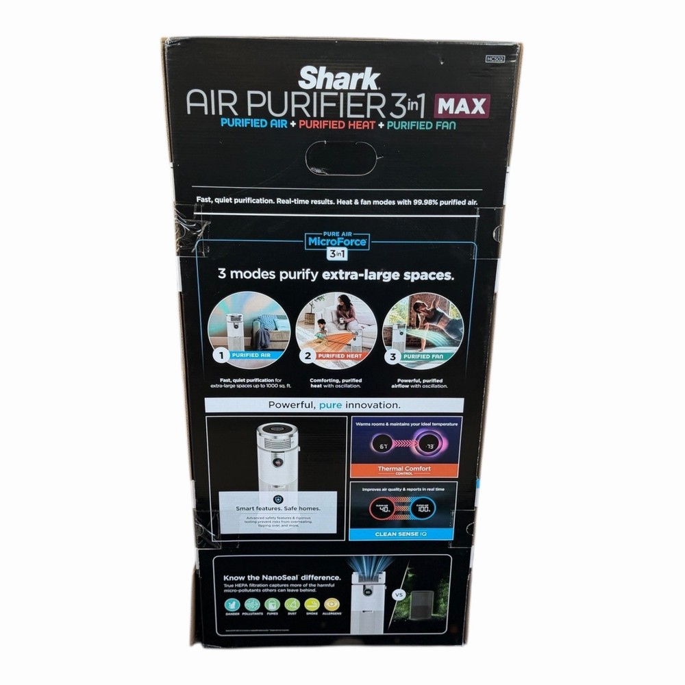 Condition: New. Factory sealed. Original retail packaging intact. Box shows light storage wear. Description: Brand new Shark Air Purifier 3-in-1 MAX, factory sealed. Combines purified air, purified heat, and purified fan in one unit. Covers extra-large spaces up to 1,000 sq ft. True HEPA filtration with NanoSeal technology and Clean Sense IQ. Model: HC502. Ships exactly as shown.