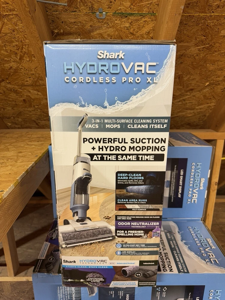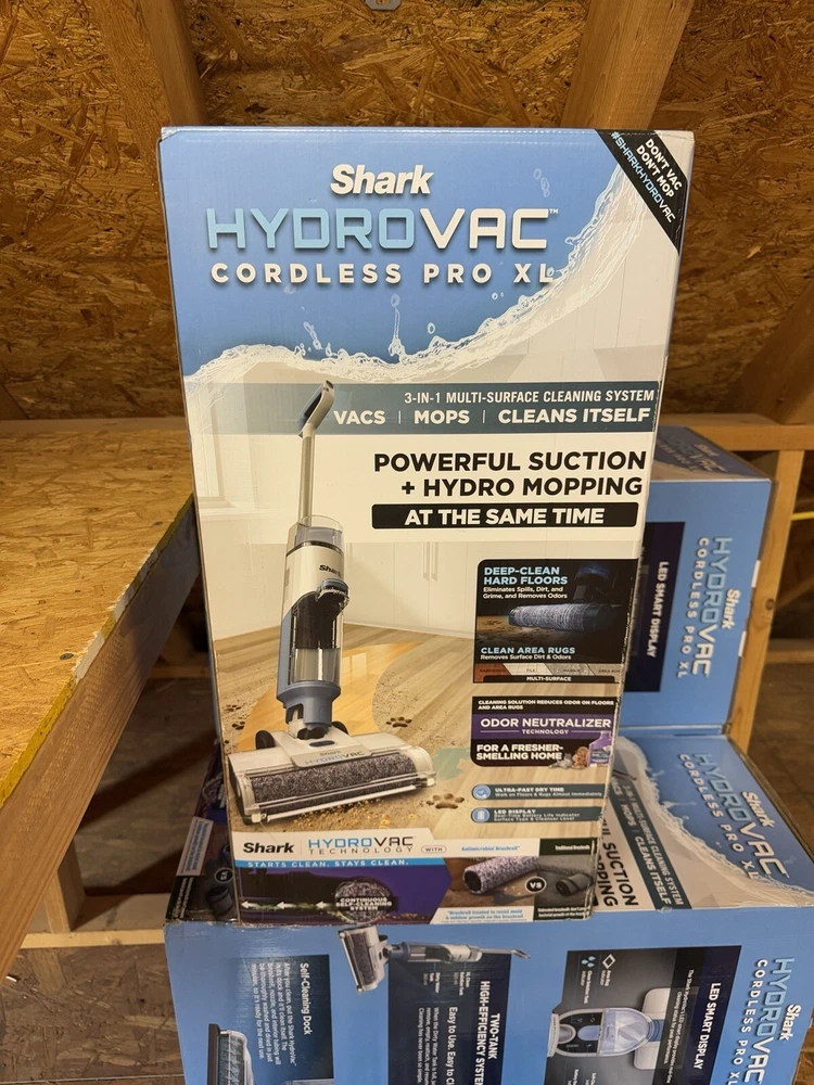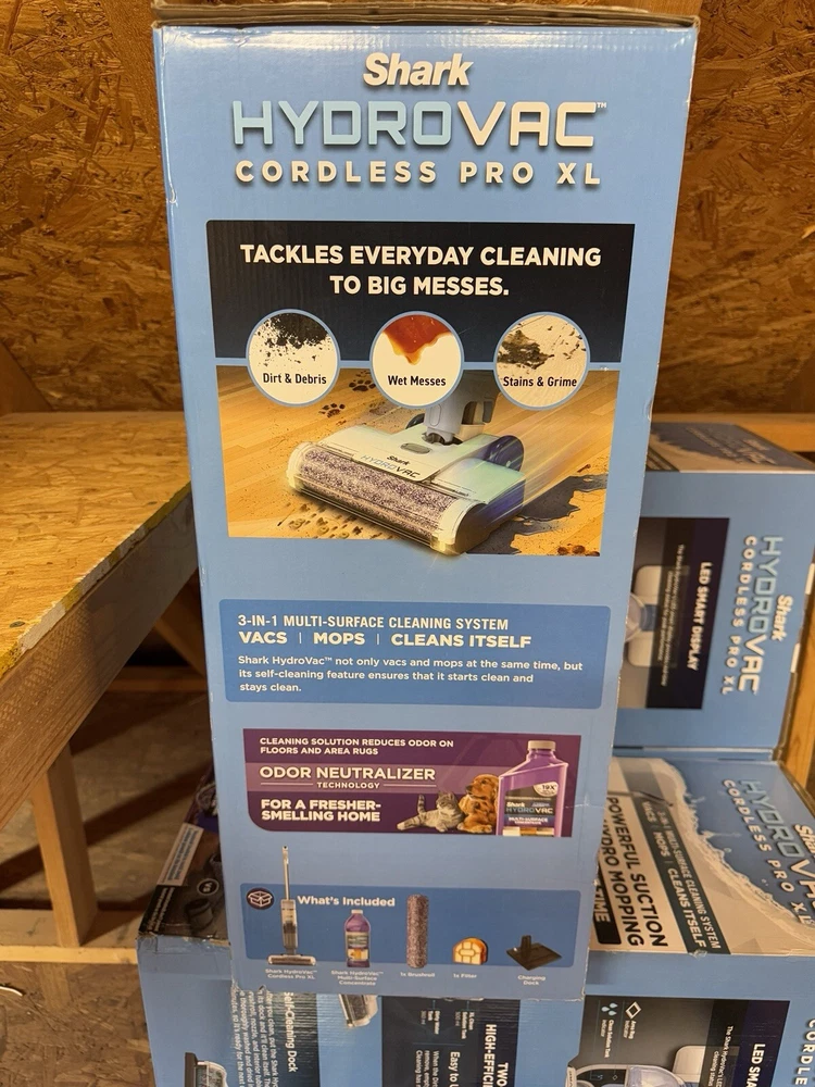 About This Product Shark Hydrolase Cordless Pro XL WD201 vacs, mops and cleans itself with powerful suction and hydro mopping at the same time. It deep cleans hard floors and cleans area rugs. Includes a self-cleaning, antimicrobial brush roll to help prevent odors and bacterial growth on the brush roll 2-tank system to separate clean and dirty water multi-surface concentrate with odor neutralizer, XL clean water tank. Brush roll treated with antimicrobial substance to preserve roller and resist bacterial odors on the brush roll. Highlights Shark cordless vacuums, mops and cleans itself at the same time to deep clean hard floors and clean area rugs Powerful suction and hydro mopping pulls in dirt and debris, wet messes, stains and grime to leave a streak-free, clean surface that you can walk on almost immediately Continuous self-cleaning system helps prevent dirt from being redeposited back on your floor and the antimicrobial Designed for all sealed hard floors including hardwood, tile, marble, laminate Multi-surface concentrate with odor neutralizer technology instantly eliminates and prevents odor from reforming on floors and area rugs Debris filtration technology in the dirty water tank is designed to separate solids from liquids so you can quickly and easily empty the tank Intelligently designed system in the XL clean tank combines smart suction and flow control to maximize cleaning efficiency Seamlessly transition between floor types with the touch of a button on the LED display that also provides real-time battery life indicator, surface type and tank levels Enjoy cordless cleaning power so you can seamlessly transition between rooms without being tied to an outlet Help you find the hidden dirt and grime for fast, efficient hard floor and area rug cleaning without missing a spot WHAT'S INCLUDED: Shark HydroVac Cordless Pro XL 3-in-1 multi-surface cleaner, 1 multi-surface concentrate, 1 antimicrobial brushroll*, 1 replacement filter and 1 charging dock. *Brushroll treated with antimicrobial substance to preserve roller and resist bacterial odors on the brushroll