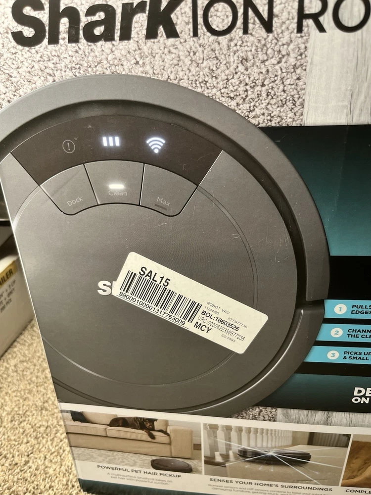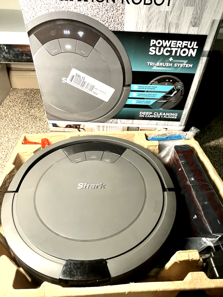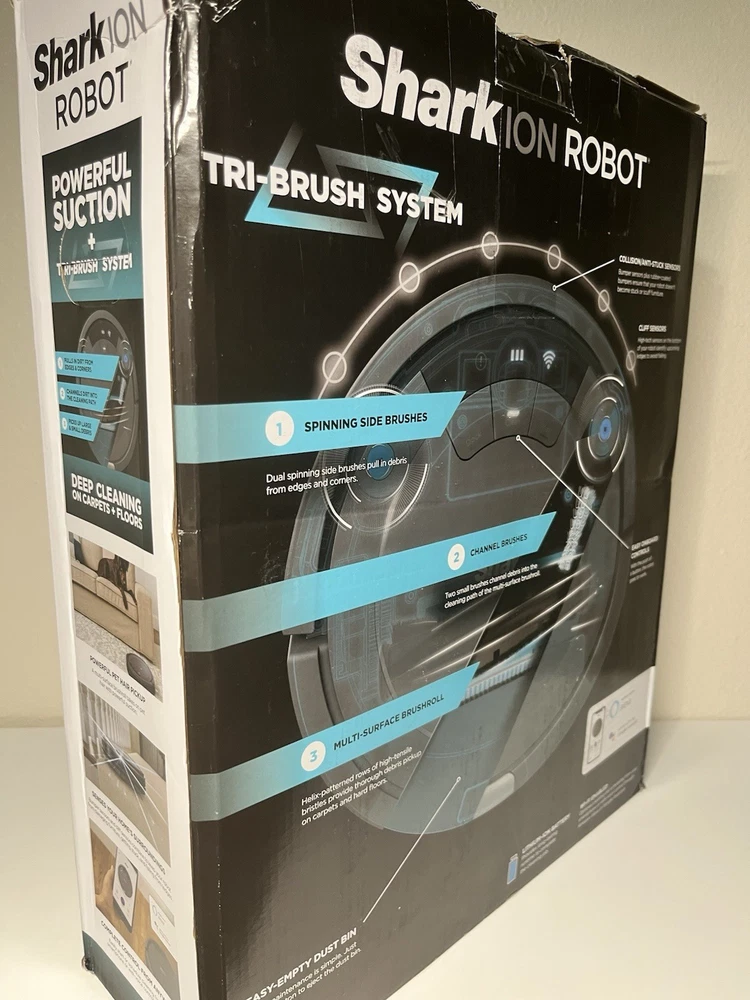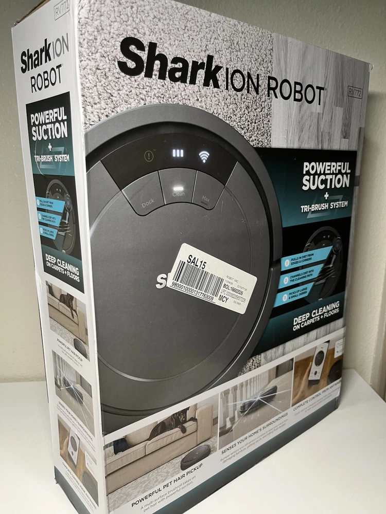 Keep your floors clean with ease using the Shark ION Robot Vacuum RV772 , a smart Wi-Fi–connected robotic vacuum designed for both hard floors and carpets. With strong suction, multi-surface brushes, and intelligent navigation, it delivers efficient everyday cleaning with minimal effort. Set Includes: Shark ION Robot Vacuum RV772 Charging dock 2 Side brushes 2 Extra Side brushes 1 Extra Filter Key Features: Wi-Fi enabled — control from the SharkClean app or via Alexa/Google Assistant Tri-Brush System tackles dirt, dust, pet hair, and debris on all floor types Smart sensors avoid stairs, obstacles, and furniture Up to 120 minutes of runtime for whole-home cleaning Slim, low-profile design fits under beds, sofas, and cabinets Easy-empty dustbin and simple maintenance Condition: Item shows standard shelf-wear from storage; fully functional as intended A reliable everyday cleaning solution — perfect for busy homes, pet owners, and anyone wanting hands-free cleaning.