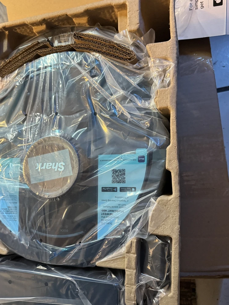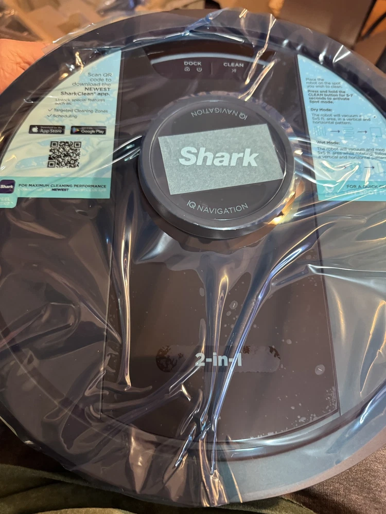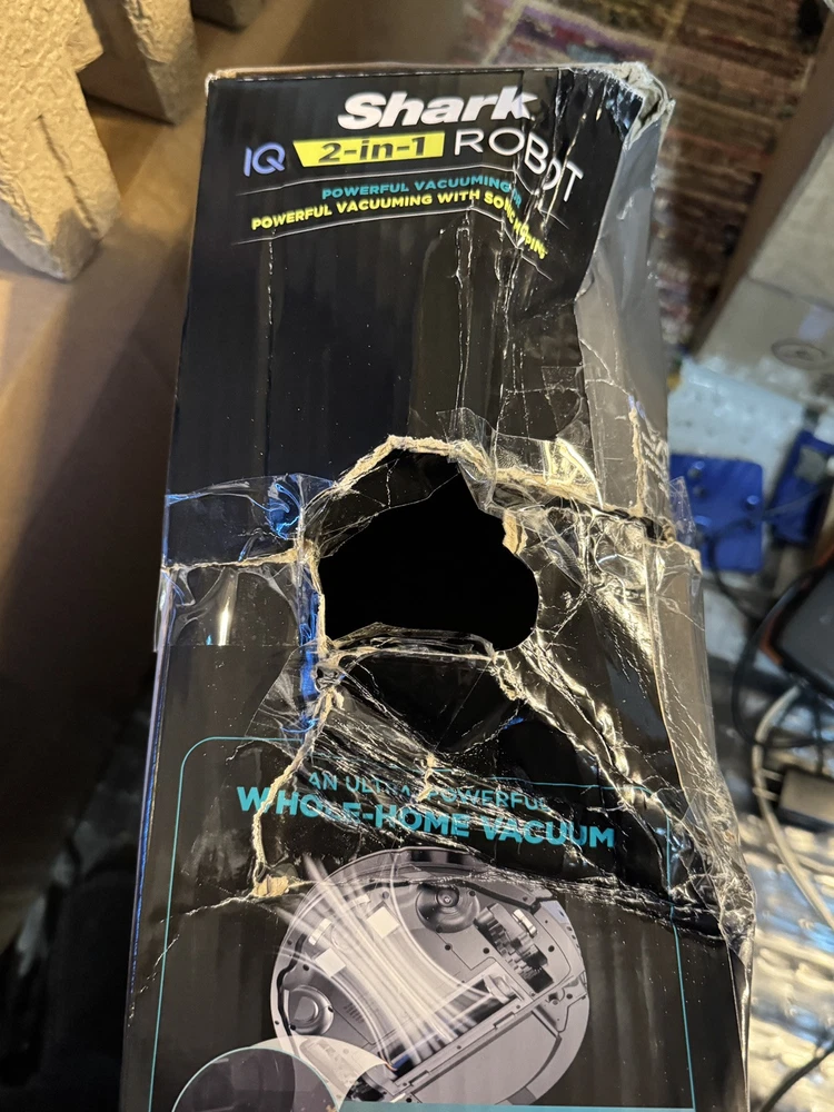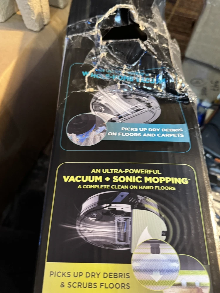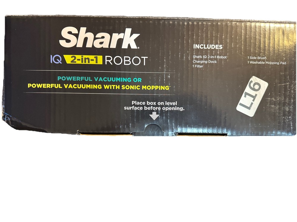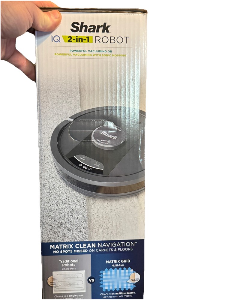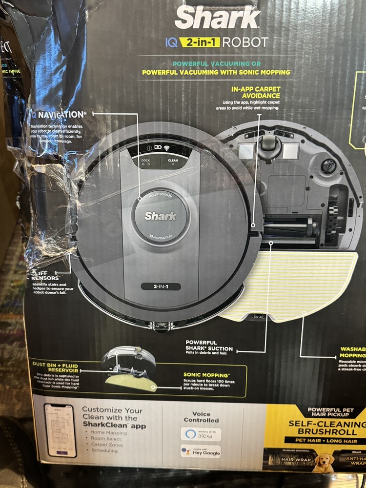 Brand new Shark IQ 2in1 Robot. Box has damage from the handle ripping on side as you can see by pics inside is factory, undamaged, and unused. Any concerns or questions please ask. Shark IQ 2-in-1 Robot Vacuum and Mop with Matrix Clean Navigation is a black bagless robotic vacuum that is compatible with Amazon Alexa. It has a runtime of 60 minutes with a 3-hour charge time and features pet hair removal, multi-surface cleaning, carpet cleaning, edge cleaning, and self-propelled functionality. The vacuum includes filters, a floor brush, and charger, and is equipped with Wi-Fi for smart home control.
