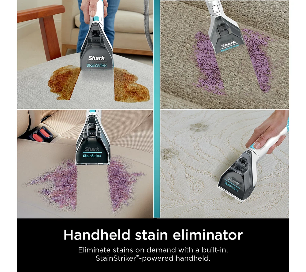Shark PX201 StainStriker Portable Carpet & Upholstery Cleaner – Powerful Stain Remover Accidents happen, but with the Shark StainStriker Portable Cleaner , you don’t have to live with the mess! This powerful, compact cleaner uses dual stain-busting formulas to tackle tough stains and odors on your carpets, upholstery, and more. Whether it’s pet accidents, food spills, or everyday messes, Shark StainStriker is your go-to tool for a spotless home. What’s Included: Shark StainStriker Portable Cleaner (Model PX201) Integrated crevice tool 3.5" reversible bristle tool for deep cleaning Pet tool for specialized stain removal 6 oz of Deep Clean Pro formula 12 oz of OXY Multiplier formula for enhanced stain and odor removal Key Features: Dual stain removers – mixes and activates powerful formulas to target tough stains and odors Suction power pulls liquid and dirt out of carpets, upholstery, and more Lightweight and portable design makes it easy to use around the house or on-the-go 12-foot cord gives you plenty of reach for large areas Pet-friendly – removes pet stains and odors with ease UL listed for safety Imported Product Dimensions: Approx. 12.83" x 11.57" x 15" Cord Length : 12 feet No more lingering stains or odors—get the Shark StainStriker today and experience hassle-free cleaning with dual stain removers , exceptional suction, and powerful formula for a deep clean every time.