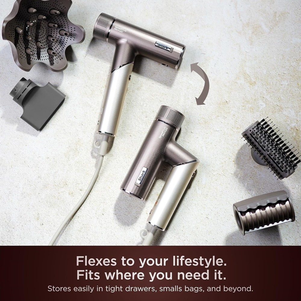 Shark SpeedStyle Pro Flex High-Velocity Hair Dryer System Ionic No Heat Damage About this item PROFESSIONAL PERFORMANCE: Style with high-velocity airflow for wet-to-dry, ultra-fast styling with no heat damage, in a compact design. Achieve flawless salon-quality blowouts, defined curls, and a high-gloss shine at home. HIGH-VELOCITY. COMPACT DESIGN: Airflow reaches 0-100 mph in less than a second. Style with higher airflow velocity in a more compact design vs the leading luxury hair dryer* *Third party tested vs. leading hair dryer over $200. SCALP SHIELD MODE: Activate to instantly reduce air temperatures to the optimum safe level for scalp comfort and root drying. Designed to protect new hair growth from extreme heat. Developed with dermatologists. Approved by stylists. FOLDING HANDLE: Folds to half its size for compact storage in bags, purses or carry-ons. Features an ultra-lightweight and compact travel-friendly design for easy carrying, while still delivering powerful drying. NO HEAT DAMAGE: SpeedStyle Pro FLEX measures and regulates temperature 1,000 times a second, never exceeding 230°F, and never approaching heat damaging temperature of 302°F. TURBO CONCENTRATOR: Designed to give you sleek, straight styles with no heat damage. It features a 360° rotatable nozzle - adjust it to your desired angle for easy, controlled styling. Perfect for every hair type. Product Description Meet Shark SpeedStyle Pro FLEX High-Velocity Hair Dryer System. Designed with professional performance in a compact, flex design without compromising power. Get salon-quality blowouts, defined curls, & high-gloss shine at home with high-velocity airflow reaching 100 mph in under a second, with no heat damage. Includes Scalp Shield — designed to protect new hair growth from extreme heat.