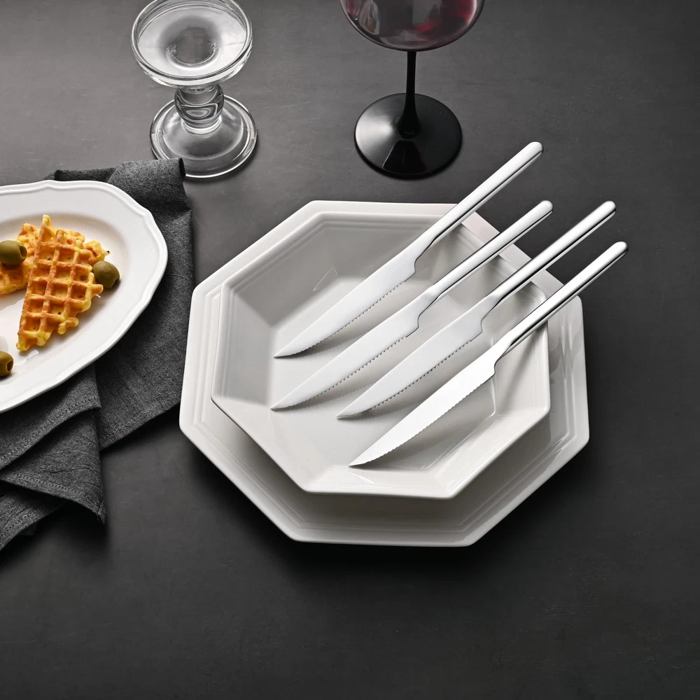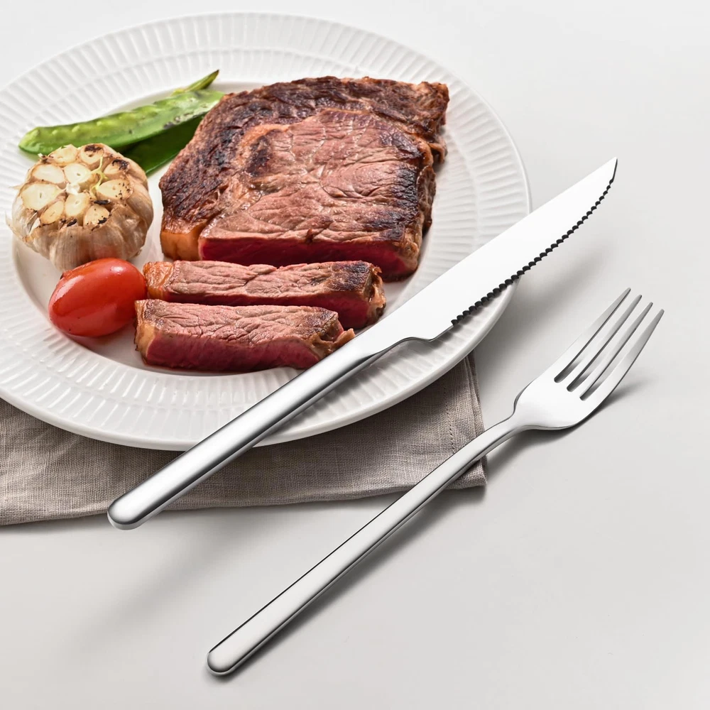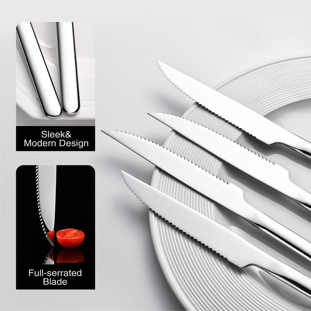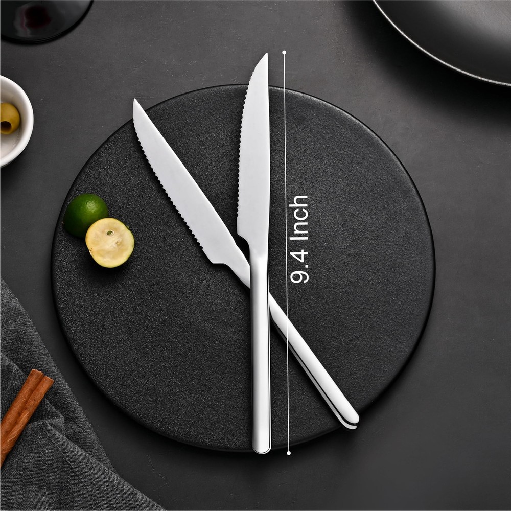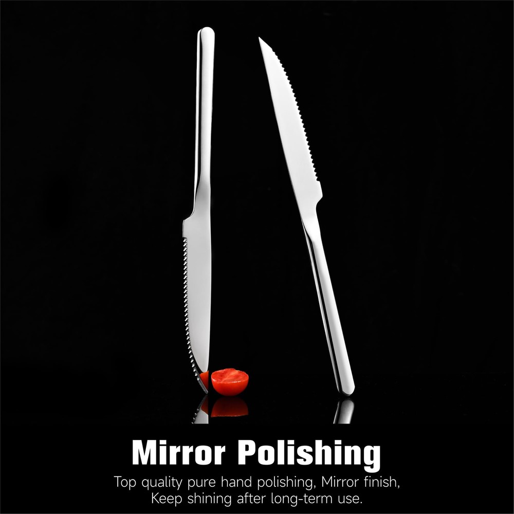 German High Carbon Stainless Steel : All steak knives are made of German high carbon stainless steel, sturdy and anti-corrosion, it will never bend and keep sharp after long-term use. Full-serrated Blade : Meticulous grinding makes the full-serrated blade extremely sharp, retaining the finest cutting feel while cutting quickly, maintain a long-lasting service life. Modern and Sleek Design : Modern and sleek design without complicated lines, makes steak knives set more elegant, perfect matched with different tableware and 66 series silverware set. Mirror Polishing : Multiple fine polishing makes the table knives surface smooth and bright, appealing to the eye and easy to clean, keep shining longer than others. Multipurpose & After-sales Support : The steak knife ideal for family daily use, BBQ, parties, camping, restaurant, hotel, wedding and other formal occasions. Not only can be used to cut steak, they also works well for pizza, ham, brisket, fish, veggies, fruits. If at any time you are not completely satisfied with your set, just feel free to us, we will be there and ready to help.