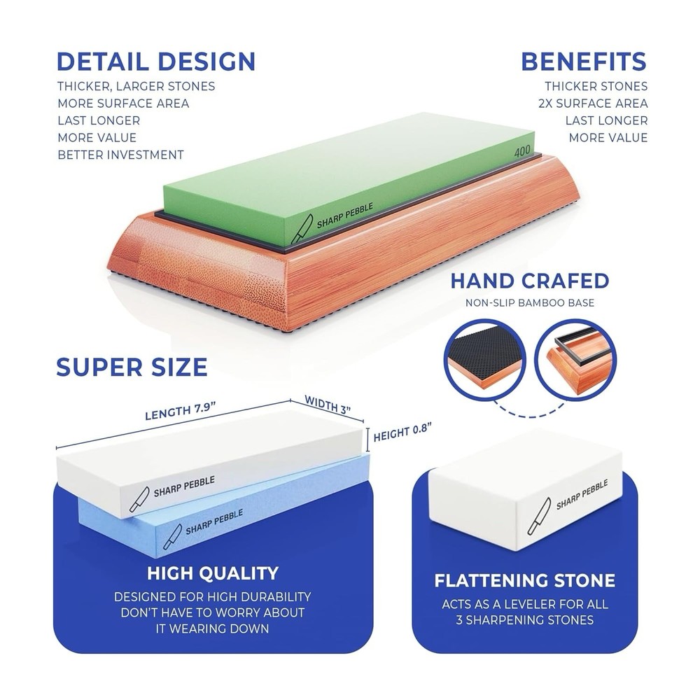 Material Silicon Carbide & Corundum (Japanese Quality) Brand Sharp Pebble Color White, Green, Blue Product Dimensions 8"L x 3"W x 2"H Item Weight 7 Pounds Grit Type Coarse, Medium, Fine Extra Large Whetones : Made of top-grade silicon carbide & corundum (aluminum oxide). Larger, thicker, oversized stones measure 8-inch x 2 3/4 inch and at a full 1-inch thickness, along with a flattening stone they have plenty of service life in them & are easy to use. These wet stones uses Water for sharpening, so no need of using expensive sharpening/honing oils Complete Sharpening Kit : This kit comes with 3 Grit 400/1000/6000 sharpening stones set well designed to achieve Razor Sharp Edge. The 400 grit is an aggressive stone for Dull Edges. The 1000 grit is used after the 400 or as a starting point for only moderately dull edges. The 6000 grit is a very fine stone and provides a very polished edge that will cut extremely well. It also includes handmade NonSlip Bamboo base making it a robust sharpening system Whetstone Flattener: Over time, your sharpening stones for knives will naturally become uneven, making it impossible to get ultra sharp razor edge. Sharp Pebble whetstone flattener is designed to keep your sharpening stones flawlessly flat and ready to use in just minutes. With timely use of flattening stone & leveling the grinding stones surfaces, these knife sharpening set should last you a lifetime Peak Performance : Our Premium Whetstone Knife Sharpener Stones Set are Larger, Thicker, Well Balanced & allows precision knife sharpening without excessive resurfacing. These wetstone set can sharpen Any Blade out there, be it any kitchen knives, chef knife, steak knife, sontoku knife, paring knife, sushi knife, cleaver knife,Diving knife, Machete, Katana, Hunting Knife Sharpener, Pocket Knife Sharpener, Blade sharpener & it can even sharpen a dull Sword Precision Sharpening : Not all knife sharpening stones set are created equal. We only source premium quality material for the manufacturing of our whetstone which will provide superior cutting performance. This tool is used by everyone, from home cooks, stay-at-home moms and DIY enthusiasts to seasoned professionals, making it a thoughtful and practical gift for family and friends