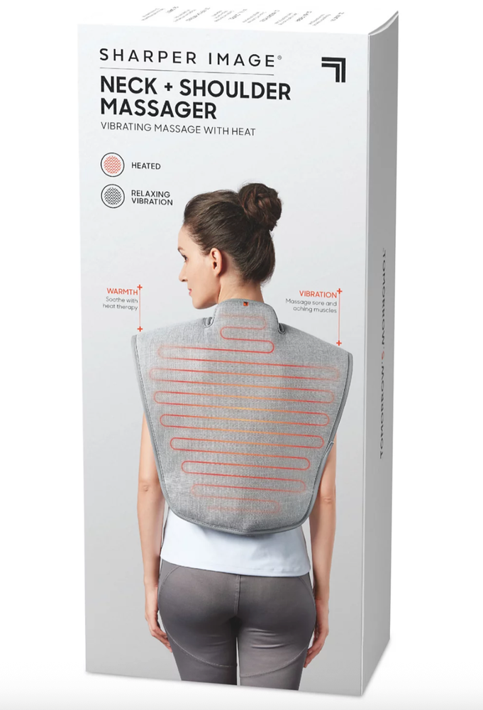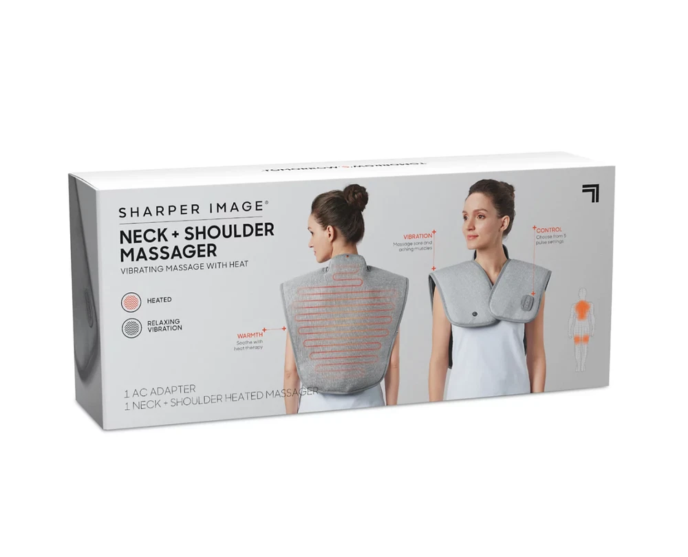 Relax your body, make life healthier and happier by adding Sharper Image Heated Neck and Shoulder Massager Wrap into your weekly routine! It's designed to apply deep-invigorating thermal care while providing a soothing massage onto your sore muscles and improve blood circulation. Features: Five massage modes Contours to neck and shoulders for comfortable, hands-free fit Plush, quilted fabric 30-minute auto off AC adapter included Approx. weight: 2.1 lbs. Approx. dimensions: 18"L x 8"W x 5"H. Polyester/plastic Spot clean only Imported