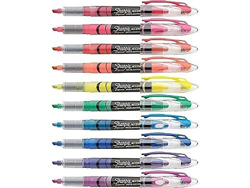Easily identify important notes with Sharpie Liquid Accent Highlighters. These liquid highlighters feature vibrant inks that quickly dry to a bold, see-through finish. The easy-glide fine chisel tip applies ink smoothly and consistently, while the integrated loop makes it easy to attach the highlighter to a binder or bag. Color(s): Assorted; Tip Type: Chisel; Assortment: Berry; Blue; Coral; Fluorescent Green; Fluorescent Orange; Fluorescent Pink; Fluorescent Yellow; Indigo; Purple; Red; Retractable: No. Sold as 10/ST. Pigmented ink for brilliant color. Versatile chisel tip is ideal for both highlighting and underlining. Loop feature at the end of the highlighter pen allows you to attach it to 3-ring binders, planners, bags and more. Quick-drying ink is odorless.
