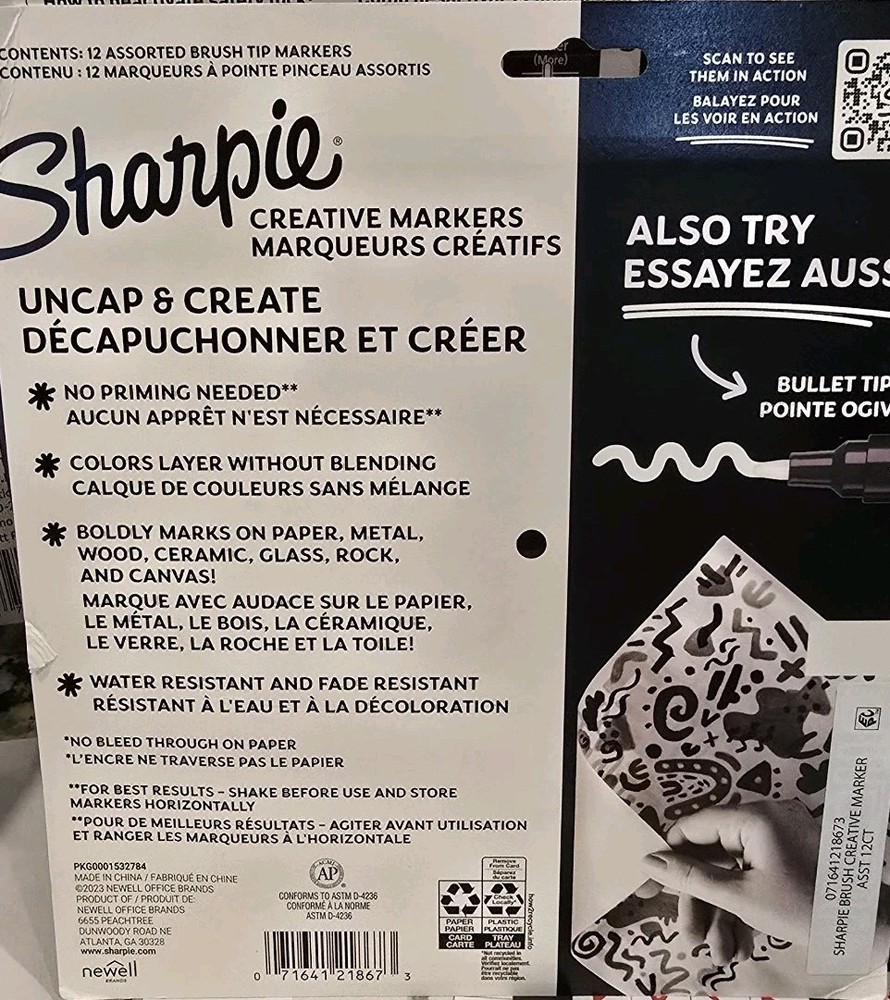The Sharpie Creative Markers are a versatile office product suitable for various art and craft projects. With a brush tip and water-based acrylic formula, these markers provide a solid finish in multiple vibrant colors. The 12-count pack offers a range of hues for expressive and detailed designs. Perfect for drawing, lettering, and all-around creative expression, Sharpie markers are a must-have for any art enthusiast or professional.
