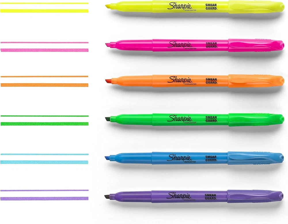 Sharpie Pocket Highlighters, Chisel Tip 24 Count (Pack of 1), Assorted Product Details Manufacturer: Sharpie Brand: SHARPIE Item Weight: 1.6 ounces Product Dimensions: 6.3 x 6.2 x 1.3 inches Item model number: 1761791 Is Discontinued By Manufacturer: No Color: Assorted Material Type: Plastic (body), Porous Material (tip) Number of Items: 1 Size: 24 Count (Pack of 1) Point Type: Chisel Line Size: 4 Ink Color: Blue,Pink Manufacturer Part Number: 1761791 Brand: SHARPIE Ink Color: Blue,Pink Number of Items: 1 Point Type: Chisel Recommended Uses For Product: Light Super-slim Sharpie Pocket Highlighters fit easily into pockets, backpacks, or clip to your shirt Bright ink stands out on the page Versatile chisel tip great for highlighting, underlining, and writing notes Resists smearing (let ink dry before highlighting) Includes 24 highlighters in assorted colors Perfect for when info is high priority and precision is a must, Sharpie Highlighters make everything highly visible with brilliant colors in transparent, smooth, and quick-drying ink. These versatile pocket highlighters are designed to fit effortlessly in your pocket or clip to your shirt for easy, on-the-go highlighting. The quick-drying ink resists smearing many pen or marker inks, while the versatile chisel tip highlights and underlines both wide and narrow lines of text. And with an array of brilliant colors, Sharpie highlighters make your most important thoughts and notes jump off the page. It’s no wonder why Sharpie is the got-to-have highlighter for life’s major high points.