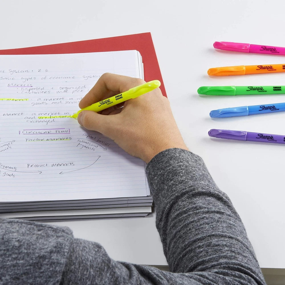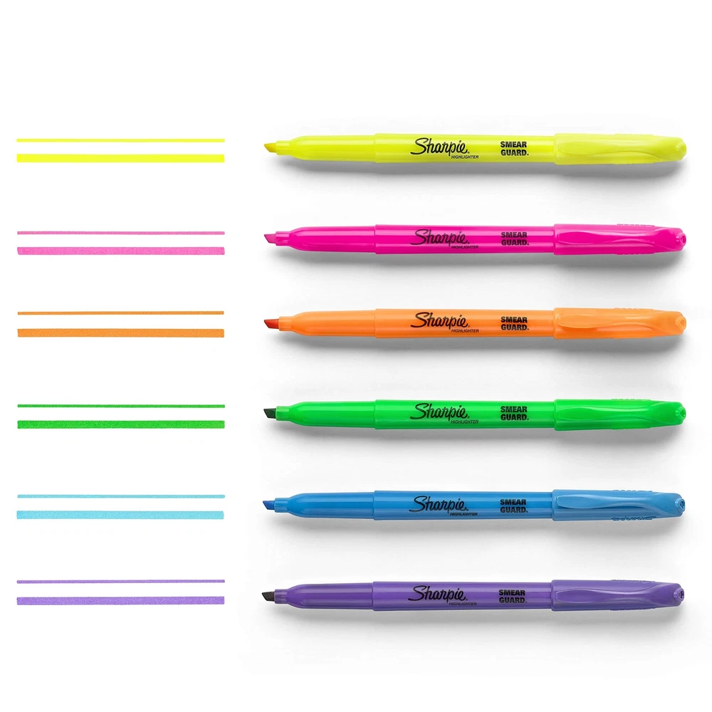Sharpie's Pack of 36 Pocket Highlighters is the perfect addition to any office, school, or home environment. Their vivid, high-contrast shades make highlighted text stand out on the page, while the slim design ensures they’re easy to control, light on your hands, and convenient to store. The narrow chisel tip is excellent for highlighting, underlining, and writing notes. Resistent to many pen and marker inks, each vibrant Sharpie highlighter is reliable, long-lasting and ensures effortless reading of highlighted text. Assorted Colors: 36 Sharpie highlighters - 8 yellow, 6 orange, 6 pink, 6 blue, 6 green, and 4 lavender Easy to Control: Slim body provides a comfortable grip and ease of use Multi-purpose Tip: Excellent for highlighting, underlining, and note writing Smudge-Free: Resistant to smearing of many pen and marker inks Vibrant and High-Contrast: Remarkably bright colors that pop out on the page Long-lasting: Dependable for regular use over lengthy periods Ideal for All: Perfect for office, school, or home use