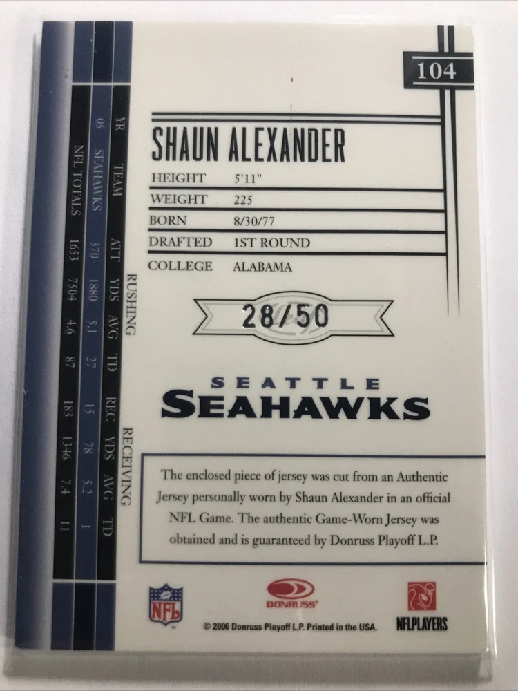 Shaun Alexander 2008 Limited GAME USED JERSEY PATCH SP SEAHAWKS HOF /50. Condition is Ungraded. Shipped with USPS Ground Advantage.