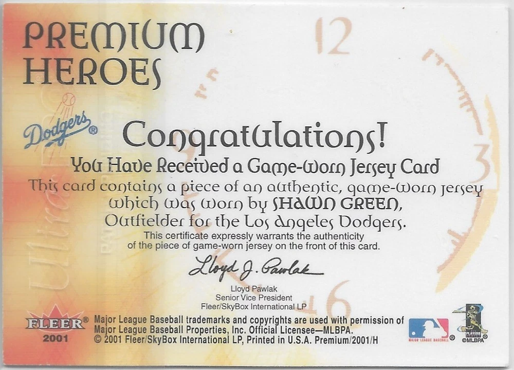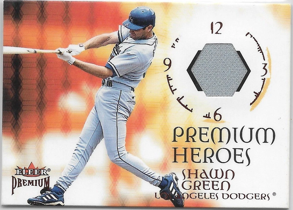 The product is a Shawn Green #5 2001 Fleer Premium Heroes Game baseball trading card featuring a jersey relic. It is part of the Heroes set released by Fleer in 2001. The card showcases Shawn Green, a baseball player, during the 2001 season. This trading card single is sought after by collectors and fans of sports memorabilia.