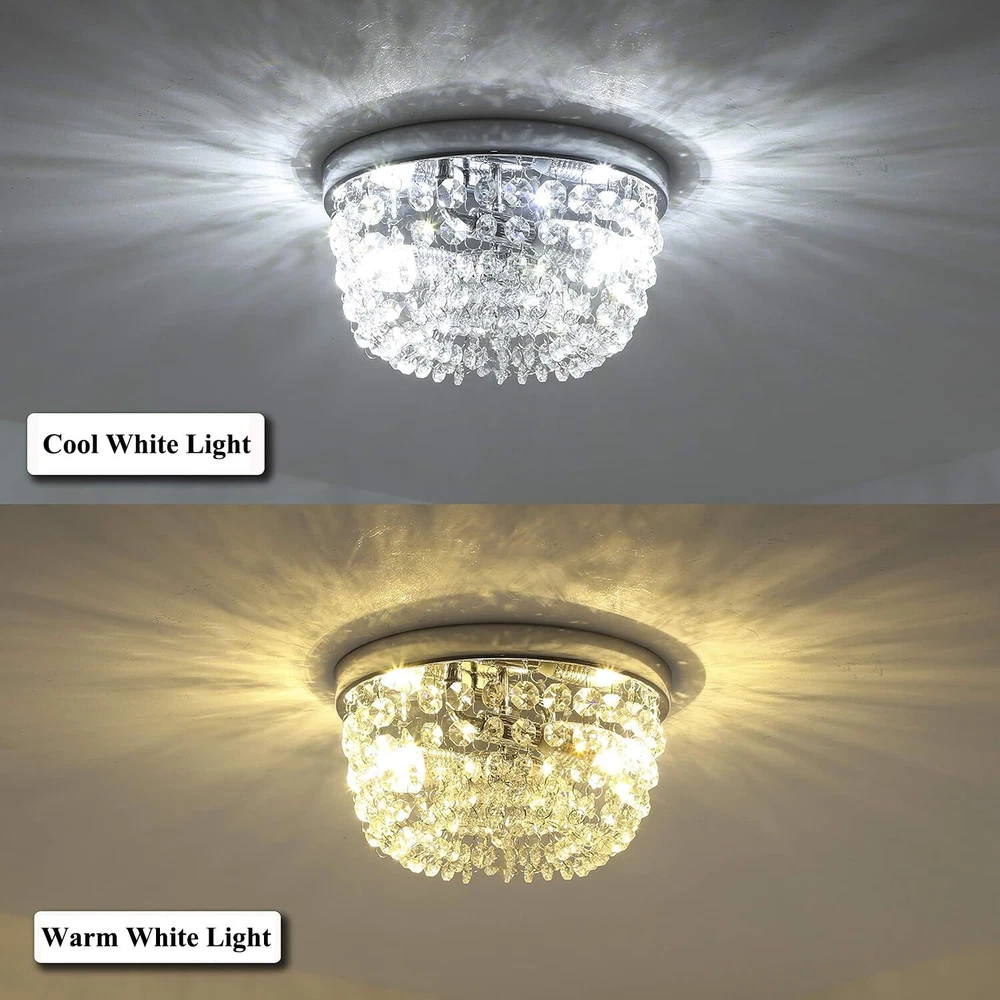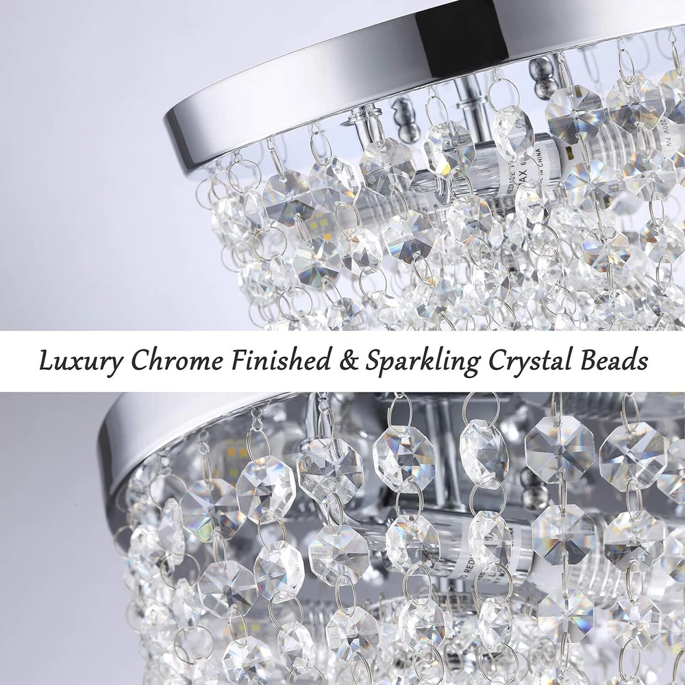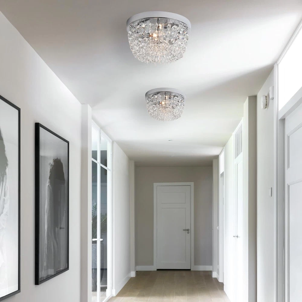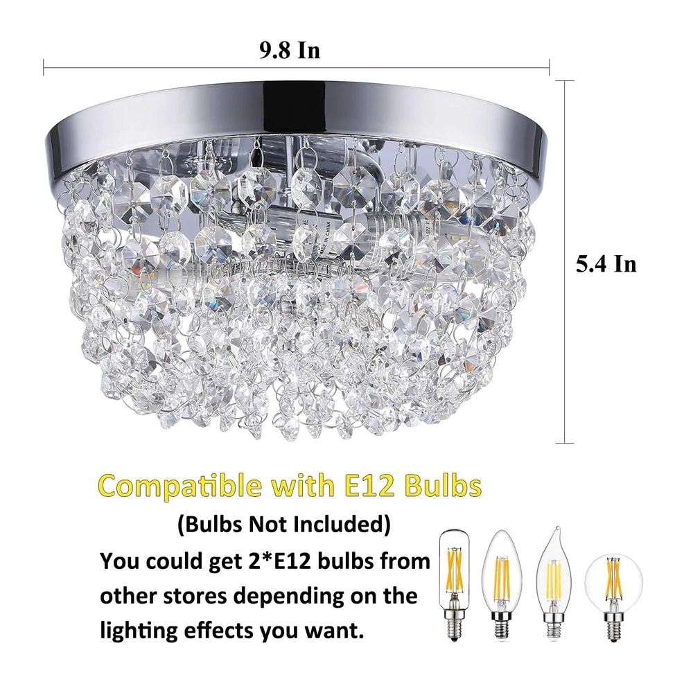 Sheenkarion Small Crystal Chandelier Flush Mount Ceiling Light,2 Lights Modern Mini Closet Chandelier,Elegant Chrome Ceiling Lighting Fixture for Bedroom Hallway Kitchen Laundry Entry,D9.8 Elegant Design:The flush mount crystal chandelier features a chrome finished sturdy steel frame and gorgeous glass crystals.The small chandelier creates a wonderful light through the exquisite crystal shade,adding much glam and personality to your space. Bulb Requirement:The crystal ceiling light uses 2 x E12 max 60 watt bulbs and gives off amazing light,compatible with LED,CEL,incandescent bulbs. It's dimmable if equipped with a dimmer switch and LED bulbs(Not Included Dimmer Switch and Bulb).You can choose different style bulbs and color temperatures to create different atmospheres. Wide Applications:The crystal light fixture is ideal for home with low or mid-height ceiling.It's a great choice for small bedroom,small living room,hallway,entryway,bedroom,closet,foyer,kitchen,girls room,dining room,etc. Perfect Size:9.8 inch diameter,5.4 inch height. Please pay attention to the size of item before purchasing. Service Satisfaction:Friendly customer service.Any problem with our ceiling lamp,please let us know,we will do our best to help you in less than 24 hours. Shipping We offer FREE shipping on all orders! We ship within Three business days of payment, usually sooner. We use a selection of shipping services such as UPS, FedEx, USPS etc. We only ship to the lower 48 states, no APO/FPO addresses or PO Boxes allowed. Local pickups and combined shipping options are not provided at this time. Return You can return a product for up to 30 days from the date you purchased it. Any product you return must be in the same condition you received it and in the original packaging. Please keep the receipt. Payment We accept payment by any of the following methods: PayPal Please pay as soon as possible after winning an auction, as that will allow us to post your item to you sooner! Feedback Customer satisfaction is very important to us. If you have any problem with your order, please contact us and we will do our best to make you satisfied. Contact Us If you have any queries, please contact us via ebay. We usually respond within 24 hours on weekdays. Please visit our eBay store to check out other items for sale! Thank you for shopping at our store.