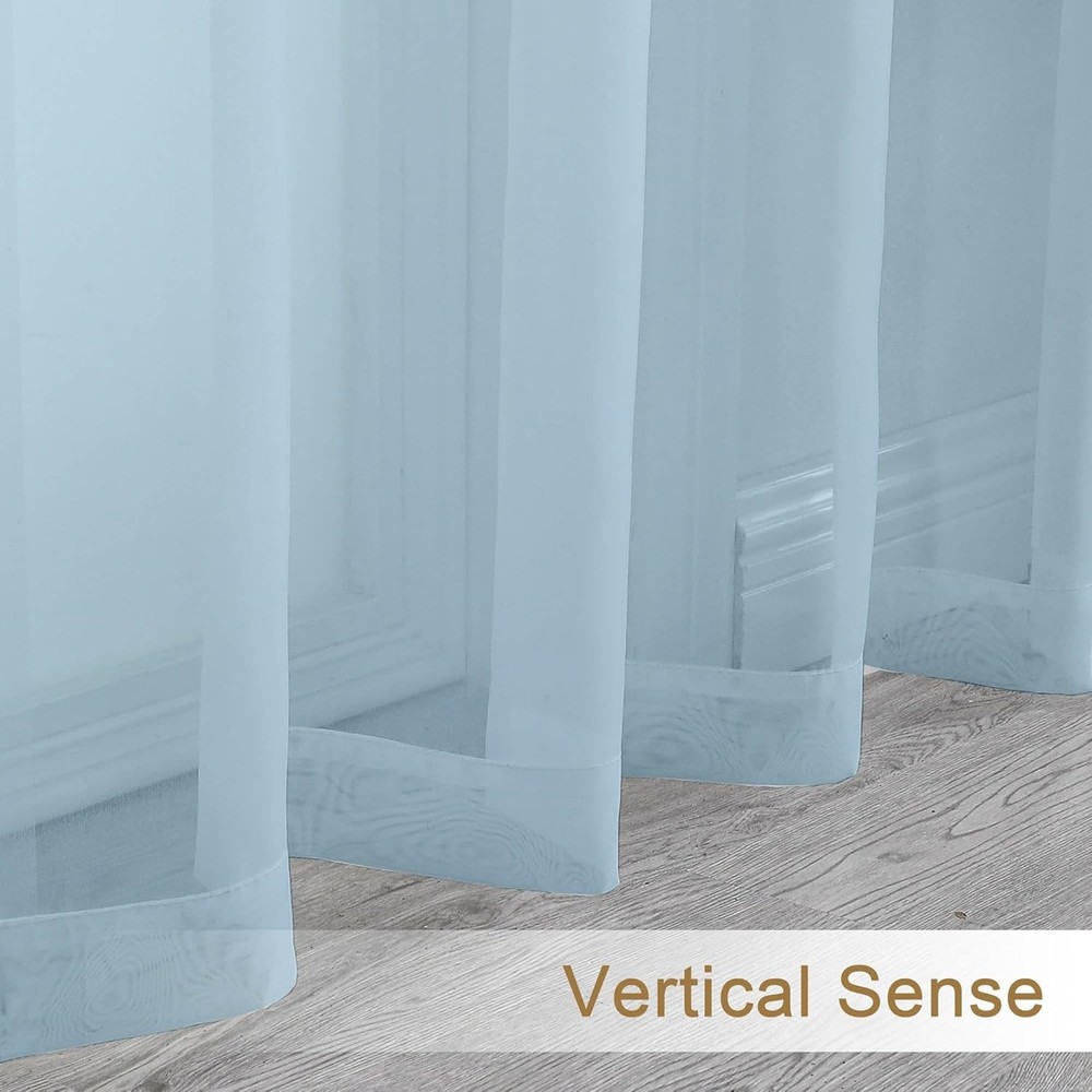 Chyhomenyc Light Blue Sheer Curtains 72 Inch Length 2 Panels, Light Filtering Soft Airy Rod Pocket Voile Window Curtain Drapes for French Door Bedroom Living Room, Each 42Wx72L Inches, Sky Blue 100% Polyester Size & Quantity: Each pack contains 2 pieces, each 42" wide and 72" long, total width is 84", total length is 73.5" including 1.5" header. The rod pocket applicable to curtain rods no wider than 1", the bottom hem rod pocket fits for curtain rods no wider than 1". Soft Curtains: Our voile sheer curtains fabric are made of high density yarn, so the curtains are durable and airy, allowing the outdoor air and sunlight to come through while protect your privacy, will liven up your indoor or outdoor spaces with a sense of airiness and breathable, also make the room air fresher. Functional: The sheer sky blue curtains versatile to go with any home decor especially bedroom, living room, guest, dinning, nursery room, also good for wedding, bed canopy, church etc. Meantime the light filtering panel is also suitable for casual, modern luxury, and country pure style. 3-Way Hanging options: Hang these sheer curtains (1) from the 2" rod pocket with the 1.5" header for a classic look, or (2) using clip rings for easy, slide open and closed (clip rings are not included), or (3) from the 2" bottom hem for a pole top look. Machine Washable: Machine wash cold in gentle cycle with like colors. Only non-chlorine bleach when needed. Tumble dry low. Remove promptly. Cool iron as needed.