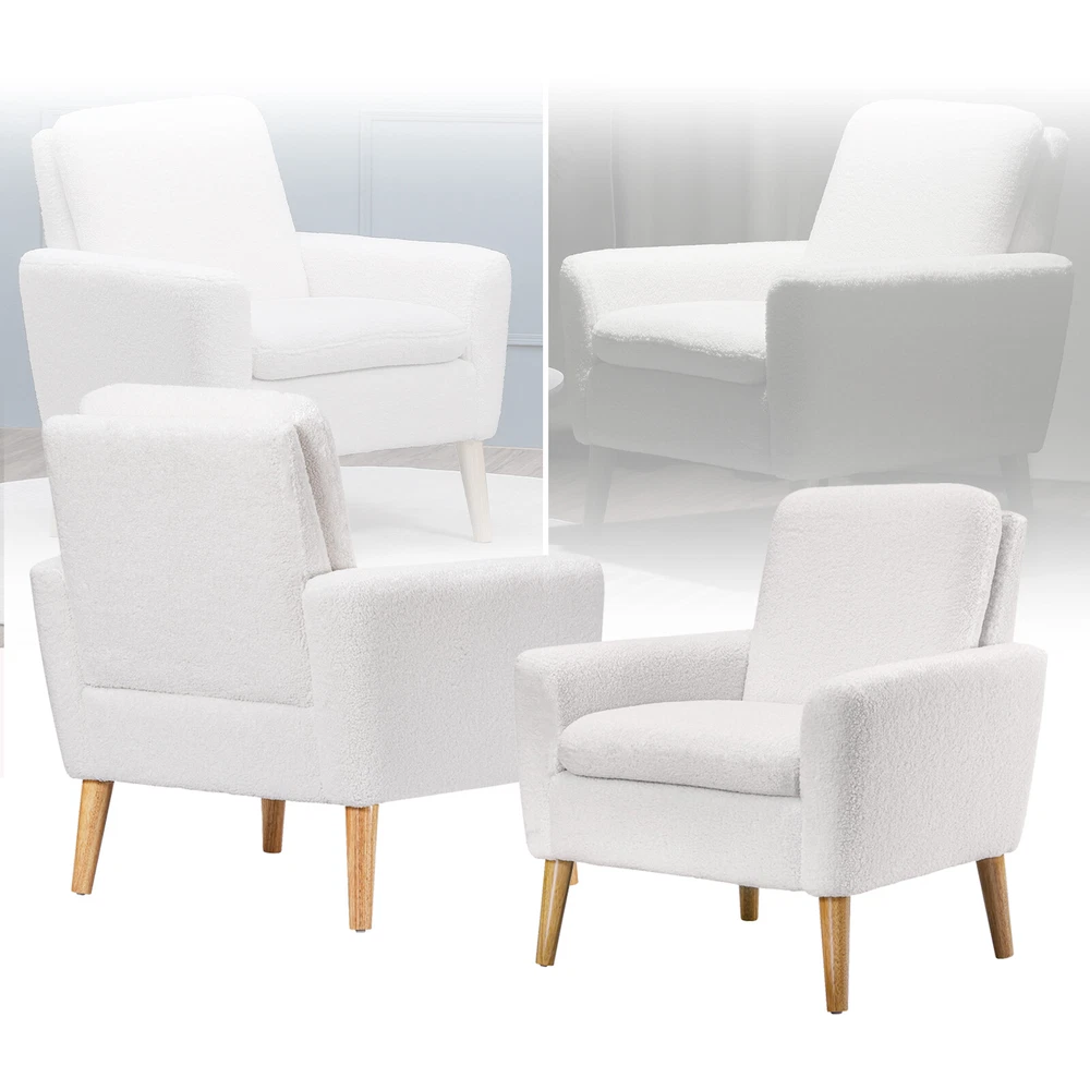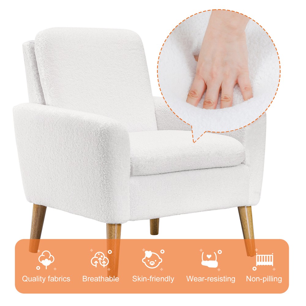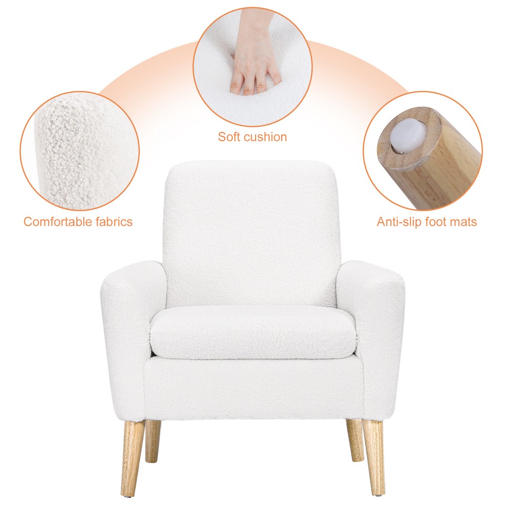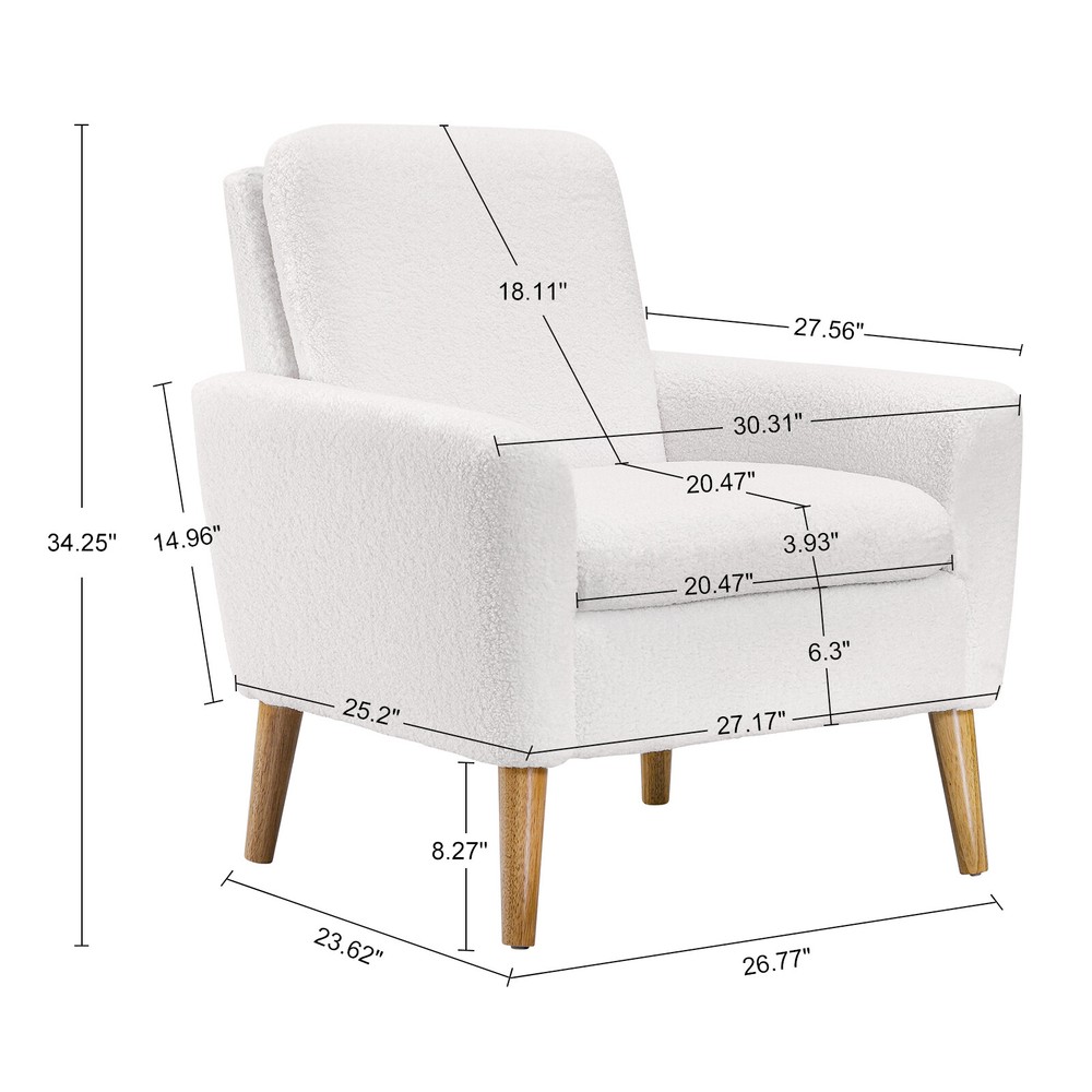 Sherpa Accent Chair White Teddy Fabric Upholstable Comfy Arm Chair for Bedroom Features: Minimalist Elegant Style Armchair: match perfectly with most decor theme is a great addition sitting chair to your living room, bedroom, apartment, dorm room Office. Ergonomically Designed: f urry sherpa fabric cover soft touch and skin-friendly comfortable padded seat cushion filled with soft sponge & S spring, ergonomic upholstered extra back cushion and curved armrest offer maximum seating comfort & cozy while sit on this comfortable chair. Durable & Long Last: solid wood frame construction and recovery soft sponge,Keep long time ride comfort and not easy to deformation, rubber solid wood legs with protective pads at the bottom, keep balance and protect the floor, can hold up to 350 pounds, so this funky living room chair will serve you for long time. Enjoy Leisure Time with This Decorative Chair: it's a great cozy chair for adults person size in some small space corner or clearance as occasional reception chair, in guest room, waiting room, club to get more comfort while reading, gaming, or in front the fireplace. East to Assemble: the single sofa chair come with partially assembled, is easy to assemble all the required accessories and installation guide are Included. can be quickly assembled. Specifications: Brand: Dazone Color: White Material: Wood Product Dimensions: 27.56"D x 26.77"W x 34.25"H Item Weight: 40 Pounds Frame Material: Rubberwood Special Feature: Durable Seat Material Type: Wood Recommended Uses For Product: Bedroom, Living Room, Reading Maximum Weight Recommendation: 440 Pounds Style: Modern Pattern: Solid Room Type: Office, Game Recreation Room, Bedroom, Living Room, Nursery Included Components: Cushion Arm Style: Rounded Seat Back Interior Height: 18.11 Inches Package includes: 1 x Arm Chair Sofa Contact us: Payment: Shipping: Warranty Return Contact us: We have always been trying to provide the best service and reliable products for every customer, however, accident may happen sometimes, please contact us to resolve any issue before leaving a negative feedback. Payment: 1. All payments must be prepaid before shipping. 2. We only accept payment via PayPal. Please kindly check if you can do the payment via PayPal before placing an order. Shipping: 1. Item will be shipped same business day if paid 4 pm EST 1 pm PDT (except weekends and holidays) and shipped from US. 2. Orders from the United States will all be shipped out via starnding shipping or economy shipping. The shipment usually takes 3-7 business days(Saturday and Sunday excluded), if you need the item urgently, please contact us for detail before purchase. Orders from overseas will be shipped via DHL Express, 3-5 business days. 3. Local pick up is not available. Warranty . The warranty shall not apply to the following circumstances: a) Damage caused by undue ware&tear, misuse, improper installation or operation, neglect, accidents. b) Damage caused by natural disaters, flood, fire, lightning or pollution. c) If item was opened, any parts removed or repaired by any unauthorized person. Return (1).We stand behind our items and offer 60 days warranty. All items are in brand new condition unless specified otherwise elsewhere in the description. (2).All returns - defective or otherwise - have to be preauthorized. Please contact us to get an authorization and returning address before sending the item back.If an item is returned because of an undeliverable shipping address, buyer agrees to pay the cost for re-shipment. (3).Please note that If the return/replacement is not a result of our mistake (not defective or wrong item), the buyer is responsible for return shipping, as well as a 20 percent restocking fee. (4).Replacement or refund will be made upon receipt of the returned item. If you do not want to wait for the replacement, you can just reorder one and then send the first one back for a refund.
