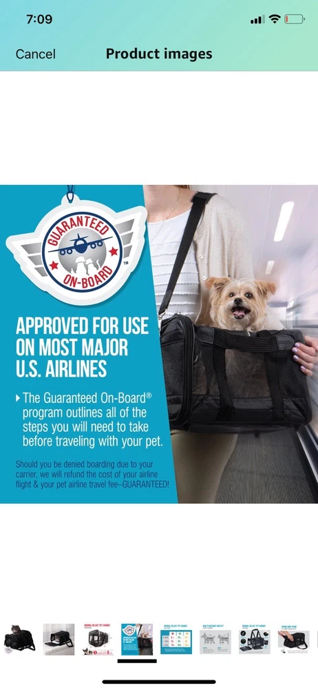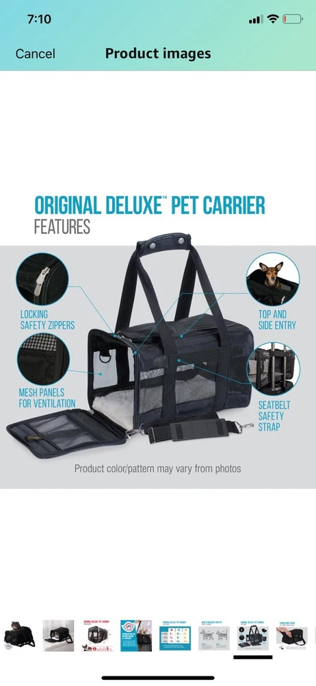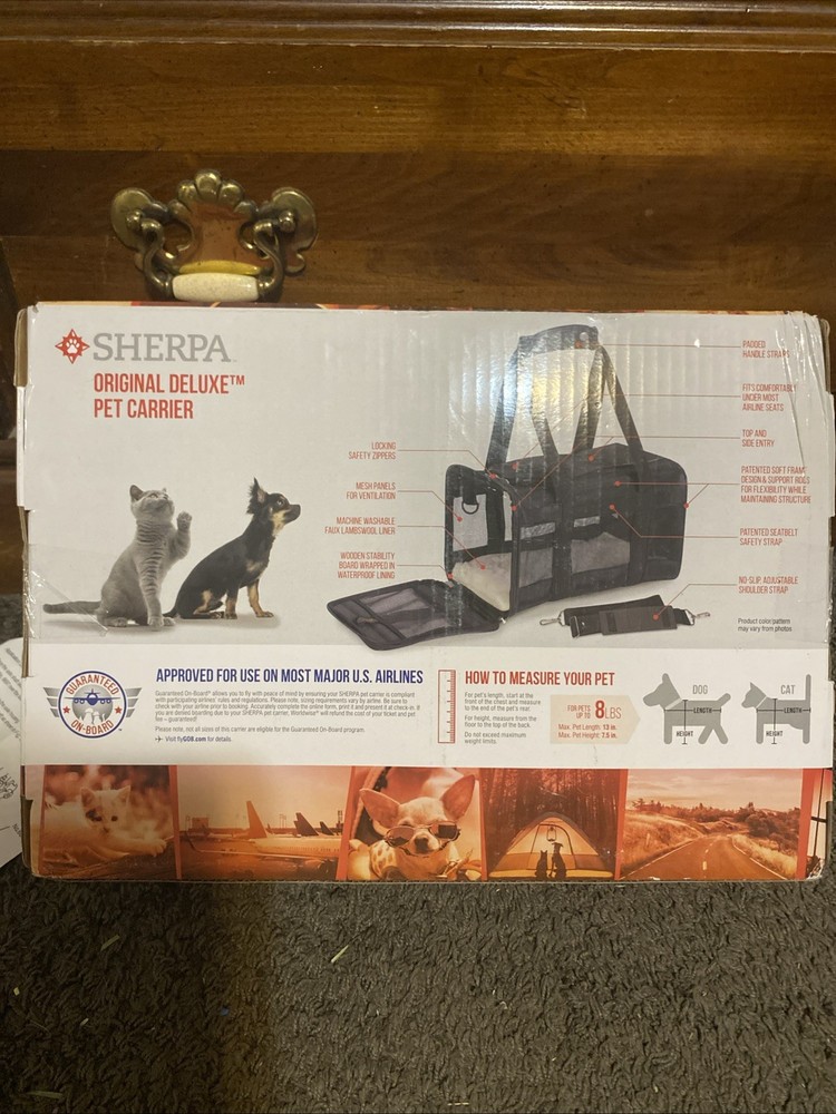 AIRLINE APPROVED: The Sherpa Original Deluxe Pet Carrier is airline approved and part of our Guaranteed On Board program, which provides comfort and peace of mind to pets and their owners; it's perfect for traveling by air, bus, car, or train IN-CABIN FRIENDLY: Our patented spring wire frame allows the rear end of the carrier to be pushed down several inches to easily fit under airplane seats in compliance with most major airline requirements and FAA regulations PERFECT FOR TRAVEL: Features mesh panels for ventilation, escape-proof locking zippers, top and side entries for easy and comfortable loading, waterproof interior base, and a removable machine washable cozy base liner VERSATILE DESIGN: Can be carried by hand with the padded top handle, or over the shoulder using the included detachable carrying strap and integrated metal D-rings - whichever suits your comfort and convenience MULTIFUNCTIONAL: The pet carrier can also be used a soft-sided crate for regular outings and vet visits with cats and small dogs; includes a large storage pocket, and a luggage strap that doubles as a seatbelt security pass-through for car rides PRODUCT DETAILS: Black, Small, 15" x 10" x 8.5"; fits pets up to 8 pounds CHOOSING THE RIGHT SIZE: Choose the perfect carrier size based on your pet's measurements, followed by their weight; make sure not to exceed the maximum weight limit, and allow enough space for your pet to change positions inside the carrier MPN: 076830 Model: 55531 ASIN: B00063433G Size: 15.0"L x 10.0"W x 8.5"H Color: black Dimensions: 15 in (L) x 10 in (W) x 8.5 in (H) Weight: 1 lb