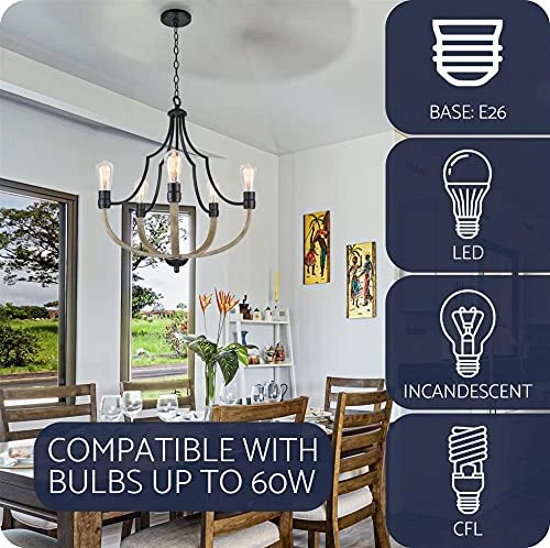 Return Policy Fast Delivery Trusted seller Sherwood 27" 5-Light Modern Farmhouse Chandelier, Smoked Birch Wood + Black Finish Product Description [FARMHOUSE DESIGN] This wide 5-light industrial pendant chandelier is an instant centerpiece, showcg sweeping arms and standout design in a smoked birch wood finish to instantly upgrade your entryway or living room. The large, curved hanging light includes high-end black accents while casting a warm glow over its installed space. This gothic chandelier is antique inspired but updated for modern times, making it a prime choice amongst designers and builders [EASY INSTALLATION] Make a bold statement in front door entryways, foyers over stairwells, in living rooms / dining rooms with cathedral ceilings or as a standout character piece in a lobby or restaurant. This rustic chandelier is very popular in luxury modern homes and hospitality spaces. Its adjustable chain can easily accommodate rooms with high and sloped / vaulted ceilings, effortlessly transforming your space [ETL LISTED FOR YOUR SAFETY] ETL listed for dry locations. Uses (5) LED, CFL or up to 60W traditional incandescent medium base bulbs. Bulbs sold separately. Pair with Edison Bulbs for a vintage look. Dimmer compatible. Includes all hardware for quick installation of this modern industrial chandelier [DIMENSIONS] Adjustable Height: 30" ~ 126", includes 8 feet of chain. Fixture Body: 27" (H) x 23" (D), Canopy: 5" (D) [FITS MANY DECOR STYLES WITH UNMATCHED WARRANTY] This unique medieval curved chandelier in a smoked birch wood finish complements all decor styles from rustic and modern, to farmhouse and country designs. Enjoy peace of mind with our 5-year warranty, ing your complete satisfaction Shipping Returns Payment Shipping Shipping is FREE to all addresses other than APO/PO boxes in the lower 48 states. All our stock ships from US-based warehouses. Shipped via USPS or UPS (depending on location and package weight) Unless stated otherwise, all orders will ship within 24-72 hours of your payment being processed. Check our feedback to see the great reviews of FAST shipping we offer. Returns Seller does not accept returns Payment We currently accept payment via eBay managed payments only. Once payment is cleared, we will dispatch your shipment within 1-3 business days. Please refer to the "Shipping" tab for more information regarding shipping speed to your destination.