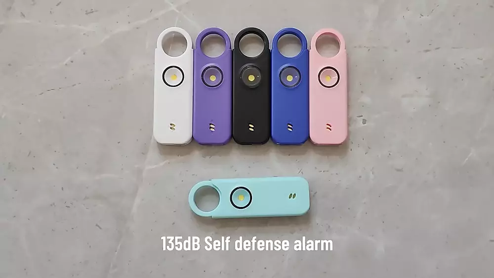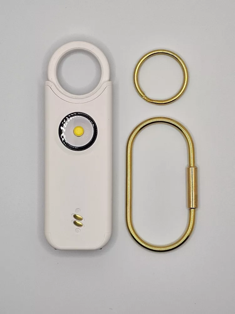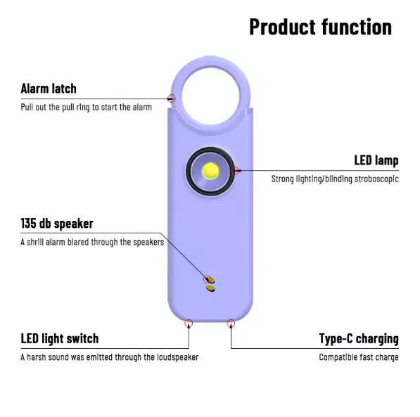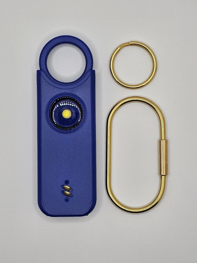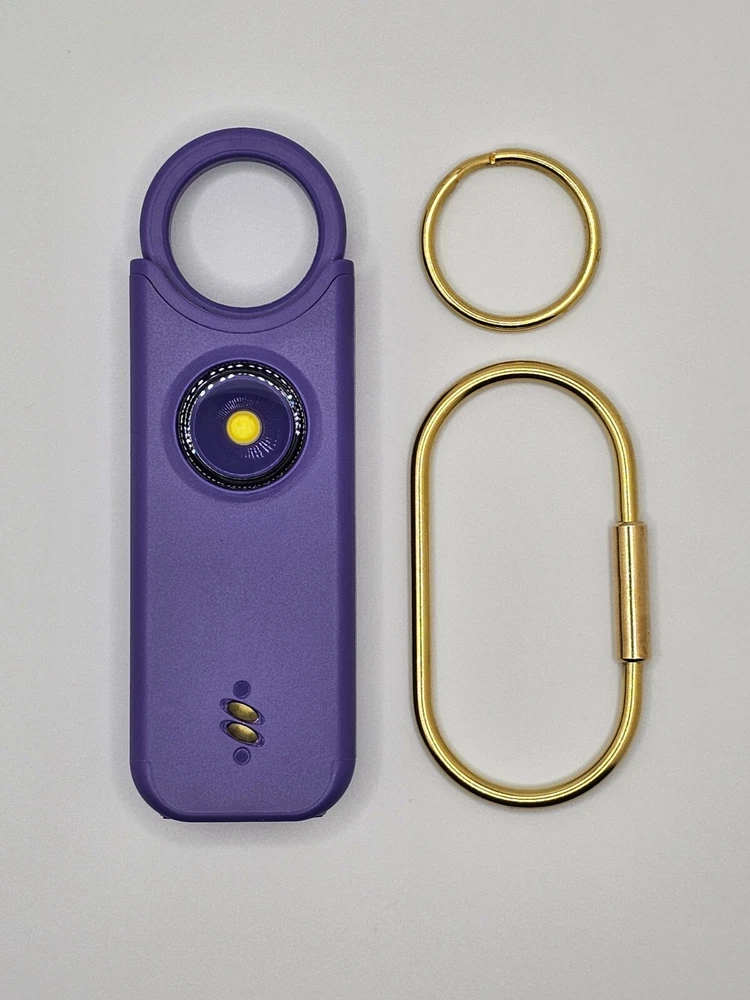 Protect yourself with this multifunctional keychain featuring a powerful 135dB siren and an LED light. Great self-defense tool for men, women, kids, students, and elderly. Deters attackers and alerts people nearby to come to your aid. Adds an extra layer of safety and security while traveling, jogging, hiking, walking the dog, etc. LIGHT: Light serves dual purposes, aiding in locating items in your purse/car or illuminating your path. Easily toggle between flashlight mode with a single click and flashing strobe light with two clicks. SIREN: Pull latch to sound alarm; light will flash at same time. Restore latch to stop alarm. Also equipped with motion-sensor mode: Press and hold LED light button for 3 seconds to activate—perfect for hanging on hotel doors—siren and light will activate upon sensoring motion. Press button again to turn off. Benefit from up to 1 hour of active alarm, 2 hours of illumination, and 3 years of standby time on the USB-C rechargeable battery. INCLUDES: USB-C Cord, Carabiner, and Key Ring.