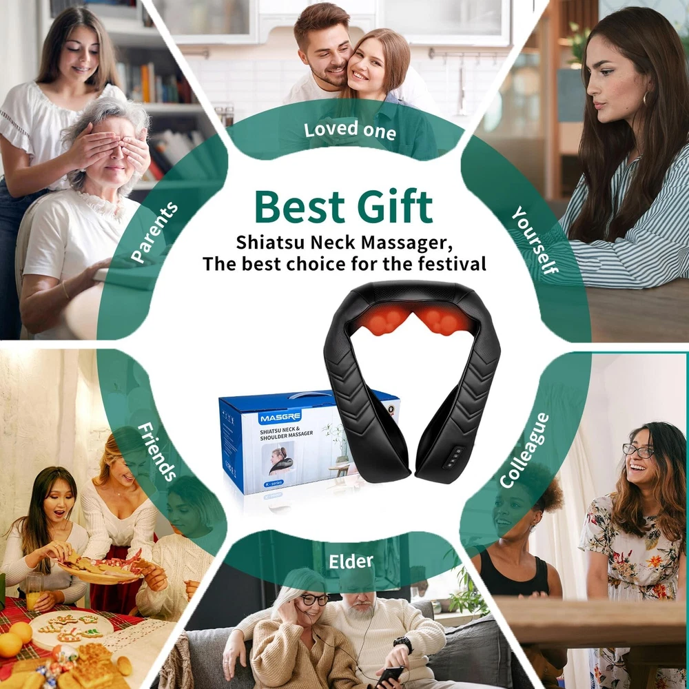 Shiatsu Neck and Back Massager with Heat, Electric 3D Shoulder Massager, Deep Tissue Kneading Massage Pillow for Leg, Body Muscle Pain Relief, Gifts for Men,Women,Mom & Dad (NOT Cordless) Product Details Use for: Neck Power Source: Corded Electric Material: Leather Brand: MASGRE Color: Black Product Dimensions : 6.89 x 7.01 x 15.94 inches; 4.1 Pounds Date First Available : December 18, 2024 Manufacturer : MASGRE Country of Origin : China 3D DEEP SHIATSU MASSAGE: Neck and Shoulder Massage--8 Deep Massage Nodes provide deep massage to your tissues and muscles. This shiatsu neck, shoulder and back massager can soothe your neck, back and shoulder muscles and eliminate fatigue and restore vitality. So that you can relax after a day of life and work, and have an happy day. HEATING FUNCTION:Neck back massager ergonomic deign. Back massager one simple press on the power button to enjoy real comfort and relief. Built-in advanced soothing heat function, the massager will improve your blood circulation. Shiatsu Back massager with heat have long handle straps , can be used to adjust the massage position and strength you like, can perfectly help you waist /arm/foot /calves/neck pain and back pain muscle. ADJUSTABLE SPEED CONTROL: with three adjustable speeds (low, medium and high), you can adjust the speed to suit your needs and you can also adjust the direction (forward/ reverse). The Shiatsu neck and back massager has overheat protection and auto-shut off in 15 minutes feature, so that you can enjoy a 15-minutes all-around massage relaxation experience even when you fall asleep, don't worry about overuse . (it also can be turned off manually). DURABLE AND SOFT MATERIAL: The shiatsu neck and shoulder massager is made from premium PU leather, which is stain-resistant and easy to clean. The massage area mades a high-quality, soft, and breathable mesh fabric, offering durability for long-term use. Back massager is a good helper for home and travel. It comes with an power adapter and car adapter. That allows you or your passengers to enjoy a soothing massage simply by plugging the power connector into the cigarette lighter. BEST GIFT FOR EVERYONE: A great and easy gift idea for your parent, friend, family or elders etc. Ideal for Christmas, birthdays, Father's Day, Mother's Day, anniversaries, Thanksgiving Day, Valentine's Day, and more. This versatile back massager brings relaxation and comfort to everyone. Surprise your family, friends, or colleagues with a gift that promotes wellness and self-care.