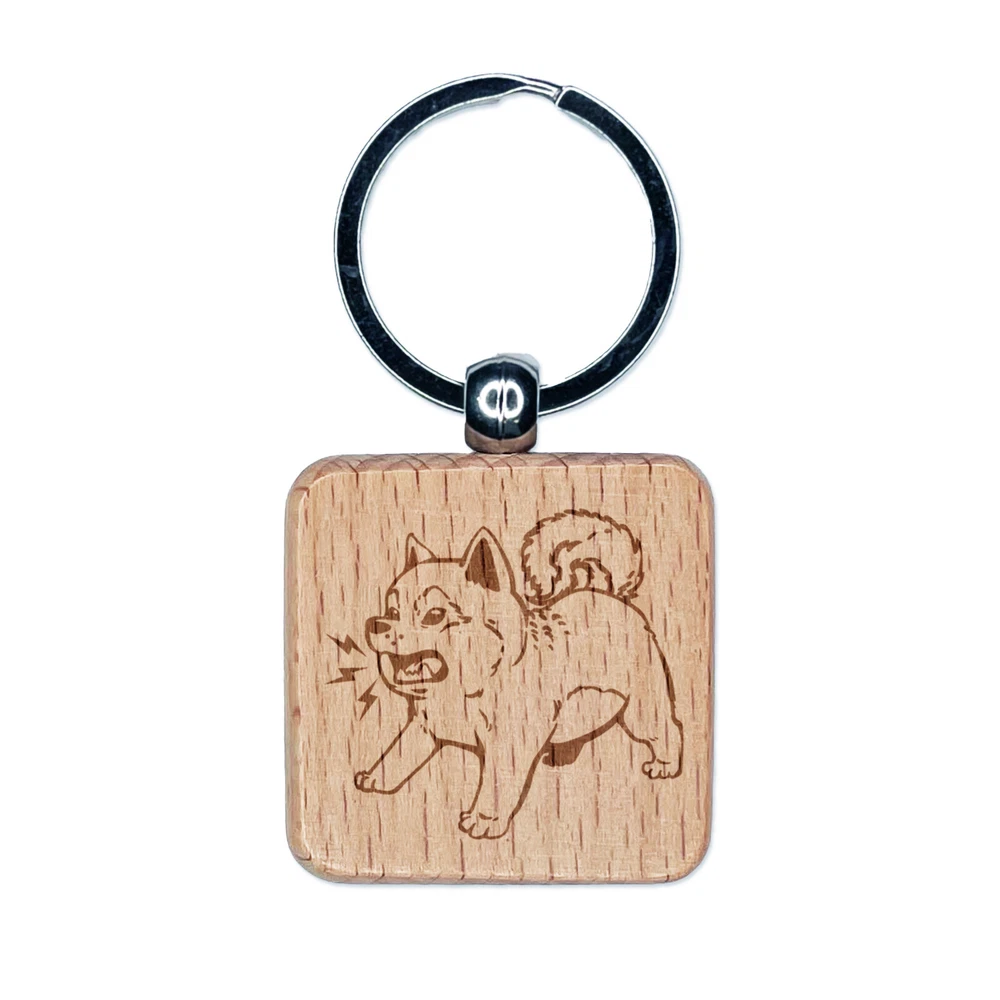 Shiba Inu Puppy Dog Barking Engraved Wood Square Keychain Tag Charm