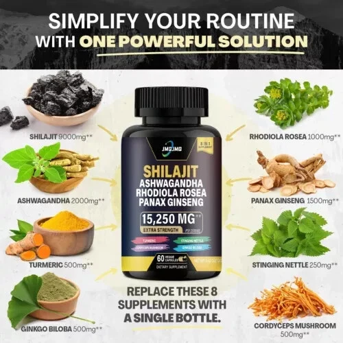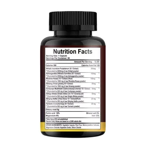 About this item Introducing our revolutionary Nature's Synergy Formula, a comprehensive combination of Shilajit Pure Himalayan, Ashwagandha, Rhodiola Rosea, Panax Ginseng, Gingko Biloba, enriched with 8 potent ingredients. Experience the power of Turmeric, Stinging Nettle, Cordyceps Mushroom and more in one convenient formula. These himalayan shilajit ashwagandha panax ginseng capsules provide a great alternative to shilajit resin, panax ginseng gummies, and ashwagandha gummies. Our advanced formula of Natural Shilajit Capsules are designed for both women and men. Zoyava presents the world's most comprehensive 8-in-1 formula, Nature's Synergy Blend featuring shilajit pure, ginko biloba, rhodiola rosea, ashwagandha extract, panax ginseng extract, stinging nettle, cordyceps mushroom, and turmeric capsules giving you a comprehensive single-dose solution that you will ever need. Discover the ultimate solution you've been searching for. Zoyava presents the perfect combination of Shilajit Supplement for men and women with 7 other potent ingredients. Our Nature's Synergy blend offers 8 beneficial ingredients in a single dosage. Unleash the power of ashwagandha vitamin, shilajit natural, rhodiola rosea capsules, all conveniently packed into just one capsule. Finally, the convenience you've been waiting for—authentic shilajit, ashwagandha powder, panax ginseng supplement. Packed with a potent blend of Shilajit Supplement, Ginkgo Biloba, Ashwagandha Capsules, Rhodiola Supplement, Panax Ginseng, Turmeric Powder, Stinging Nettle and Cordyceps Mushroom it offers an abundance of benefits. Say goodbye to the clutter of countless supplements in your cabinet and make room for a single solution. Zoyava presents a groundbreaking 8-in-1 formula Nature's Synergy Solution. Legal Disclaimer Statements regarding dietary supplements have not been evaluated by the FDA and are not intended to diagnose, treat, cure, or prevent any disease or health condition.