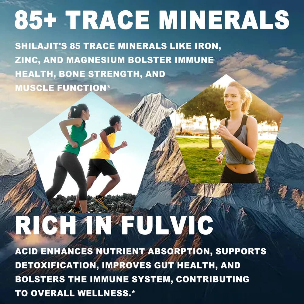 Effects: Anti-fatigue, Energy & Endurance Ingredients: Shilajit Directions: Take 2 capsules once daily after a meal. Shipping: Ships within 48 hours on working days. Shelf life: 2 years Description: Our Shilajit capsules are a natural and effective brain enhancer that improve cognitive function and mental clarity. Shilajit also helps fight fatigue, muscle recovery, energy production, heart health, hormonal balance, improves endurance and improves mood. Powerful Antioxidant - Shilajit is a natural source of trace minerals and fulvic acid. Fulvic acid is an antioxidant that aids in cell regeneration and metabolism. PREMIUM QUALITY - Our capsules are manufactured in a GMP certified factory to ensure high quality, and independently tested by a third party. Non-GMO, free of gluten, wheat, dairy, sugar, soy and yeast. Document
