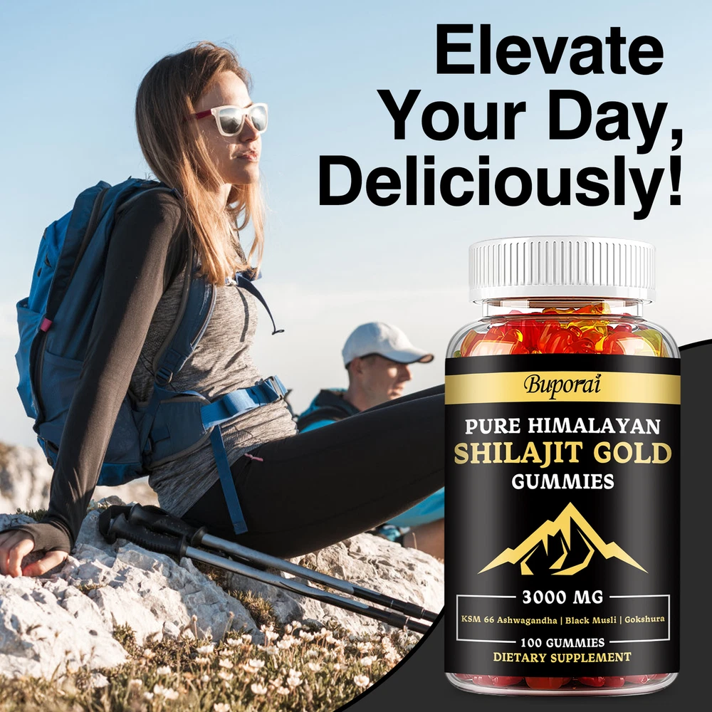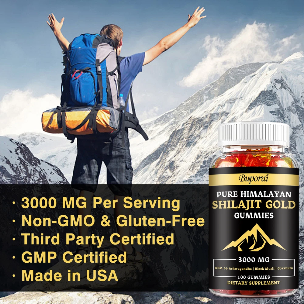Effects: Muscle Health, Energy and Endurance Ingredients: Shilajit, Ashwagandha, Tribulus Terrestris, Panax Ginsengs Directions: Take 2 gummies once daily after a meal. Shipping: Ships within 48 hours on working days. Shelf life: 2 years Description: From the Himalayas: Sourced from the pristine highlands of the Himalayas, our Pure Himalayan Shilajit contains pure organic gold grade shilajit from 18,000 feet above sea level. Specially formulated to boost energy and help improve daily exercise and recovery to help you on your health transformation journey. Boost Vitality: Our powerful full-strength supplement combines potent extracts of Himalayan Shilajit Resin, Ashwagandha, Panax Ginseng, Tribulus Terrestris, and more. These ingredients help boost your overall well-being by helping to increase strength, aid post-workout muscle recovery, and reduce fatigue. Document