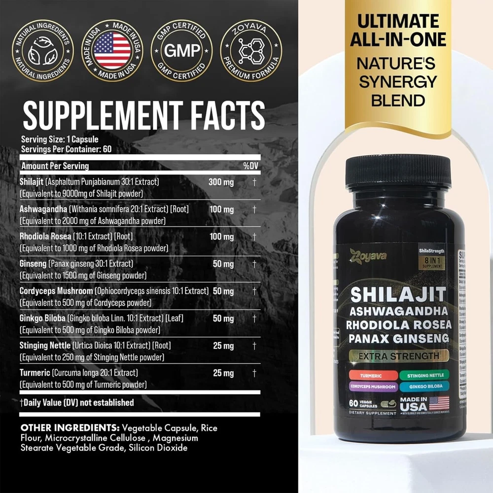 Created with Eselt - Mobile Templates for eBay Sellers C-Discount Give us a call Send us a message Created with Eselt - Mobile Templates for eBay Sellers Our Store Seller Profile Feedback About us Contact Created with Eselt - Mobile Templates for eBay Sellers Shilajit 9000 Panax Ginseng 1500MG Ashwagandha 2000MG Rhodiola Rosea 1000MG, Tur Shilajit 9000 Panax Ginseng 1500MG Ashwagandha 2000MG Rhodiola Rosea 1000MG, Turmeric 500MG, Gingko Biloba 500MG, Stinging Nettle 250MG, Cordyceps Mushroom 500MG (60 Caps) About this item Introducing our revolutionary Nature's Synergy Formula, a comprehensive combination of Shilajit Pure Himalayan, Ashwagandha, Rhodiola Rosea, Panax Ginseng, Gingko Biloba, enriched with 8 potent ingredients. Experience the power of Turmeric, Stinging Nettle, Cordyceps Mushroom and more in one convenient formula. These himalayan shilajit ashwagandha panax ginseng capsules provide a great alternative to shilajit resin, panax ginseng gummies, and ashwagandha gummies Our advanced formula of Natural Shilajit Capsules are designed for both women and men. Zoyava presents the world's most comprehensive 8-in-1 formula, Nature's Synergy Blend featuring shilajit pure, ginko biloba, rhodiola rosea, ashwagandha extract, panax ginseng extract, stinging nettle, cordyceps mushroom, and turmeric capsules giving you a comprehensive single-dose solution that you will ever need Discover the ultimate solution you've been searching for. Zoyava presents the perfect combination of Shilajit Supplement for men and women with 7 other potent ingredients. Our Nature's Synergy blend offers 8 beneficial ingredients in a single dosage. Unleash the power of ashwagandha vitamin, shilajit natural, rhodiola rosea capsules, all conveniently packed into just one capsule. Finally, the convenience you've been waiting for—authentic shilajit, ashwagandha powder, panax ginseng supplement Packed with a potent blend of Shilajit Supplement, Ginkgo Biloba, Ashwagandha Capsules, Rhodiola Supplement, Panax Ginseng, Turmeric Powder, Stinging Nettle and Cordyceps Mushroom it offers an abundance of benefits. Say goodbye to the clutter of countless supplements in your cabinet and make room for a single solution. Zoyava presents a groundbreaking 8-in-1 formula Nature's Synergy Solution Trusted Third-Party Validation: Our Zoyava Shilajit 8-in-1 Supplement undergoes rigorous 3rd party lab testing in USA, confirming its premium quality, free from contaminants, and delivering the pure essence of sea moss. Rest assured that our shilajit capsules and ashwagandha supplements are meticulously formulated in a registered and certified facility right here in the USA. With our products, you won't find any unnecessary preservatives or fillers. Brand Zoyava Item Form Capsule Manufacturer Zoyava Item Package Quantity 1 Package Information Bottle Package Dimensions : 4.13 x 1.81 x 1.77 inches; 2.5 ounces Created with Eselt - Mobile Templates for eBay Sellers Payment PaymentWe accept PayPal, PayPal Credit, Visa, Mastercard, American Express, Discover, Google Pay, and Apple Pay. Immediate Payment is required! Shipping Free Standard Shipping (2 to 5 Business Days) Returns 30 Days Returns Other Thank you for shopping with us! Created with Eselt - Mobile Templates for eBay Sellers Links Our Store Seller Profile Feedback About us Contact More items Are you looking for something similar? See our other items! Show more items Contact Give us a call Send us a message