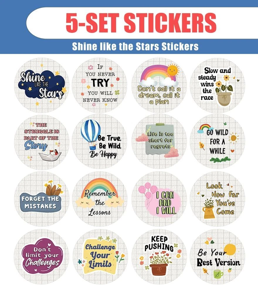 16 UNIQUE DESIGNS INSPIRING STICKERS FOR YOUR DIY PERSONALIZED DECORATIONS - Creanoso Shine Like The Stars Stickers (5-Sheets). These colorful and uniquely inspiring round shaped stickers are the best tool for DIY decoration and personalization of your belongings. GREAT STOCKING STUFFERS , TEACHING SUPPLEMENTARY MATERIALS, AND GIVEAWAY - Great stocking stuffers gifts for Boys, Girls, Teens, Kids. A perfect design to give during classroom school activities, home schooling,birthdays, anniversaries, family day, and any other special occasions. MADE WITH DURABLE AND WATERPROOF MATERIALS - There is a lamination or coating to make the stickers high water resistant, and WILL NOT fade from the water. The stickers can stick it anywhere you like, and it sticks there and lasts a long time. A COLORFUL AND DECOR STICKER DECAL - Each sheet with 16 individual round stickers. There are 5 sheets , with a total of 80 pcs of stickers. STICKER SIZE: 1.5 INCHES IN DIAMETER Shine like the Stars Stickers (2-Sets x 6 Cards) COLORFUL AND COLLECTION OF TEXT STICKERS • Well designed. • Very encouraging. • Self-adhesive. Shine like the Stars Stickers (2-Sets x 6 Cards) are super fun to collect; you can't have just one! That's why you will find a selection of stickers right here. Each package comes with different stickers in a variety of designs. Stick them here, stick them there, stick them everywhere! Everyone will love these self-adhesive stickers. These colorful stickers are perfect for any adults and these come with very inspiring messages and bright pictures. A fun, inexpensive way to add a decorative, notes, and stationery. Delight yourself with uplifting messages designs that are very encouraging. Shine like the Stars Stickers (2-Sets x 6 Cards) perfect for giveaways, behavior incentives, prizes! These stickers are acid-free, nontoxic, and safe for use on photos. This product comes with a 60 days money back guarantee. You can return them to us for a full refund.