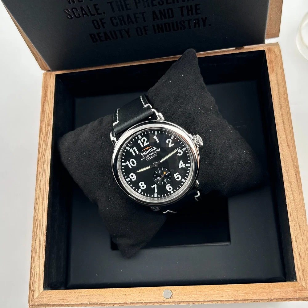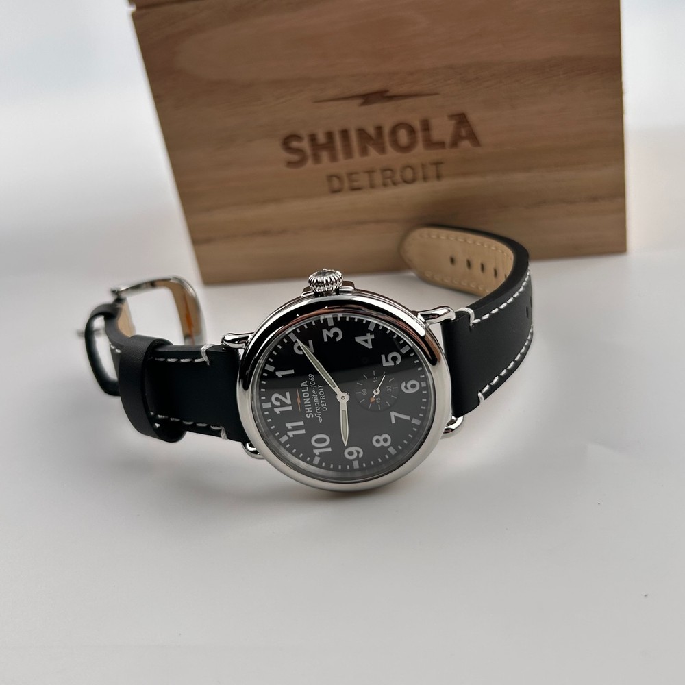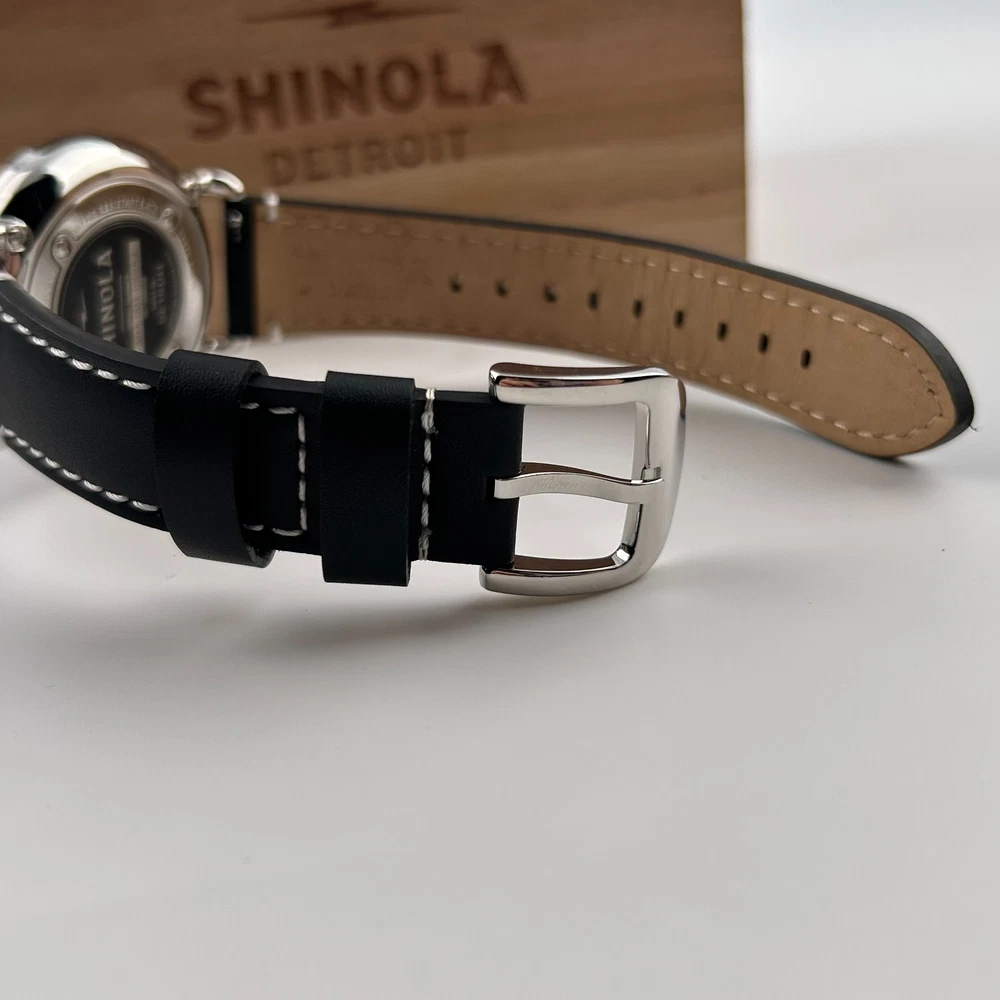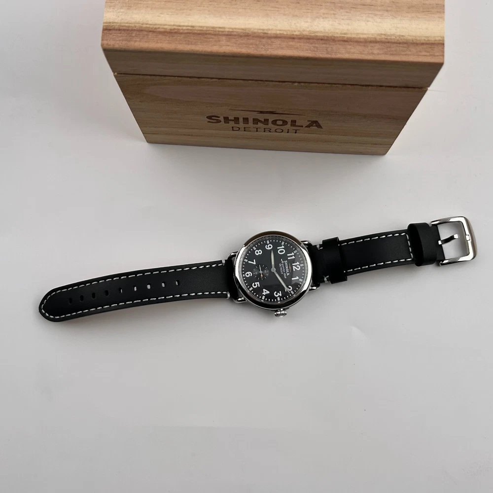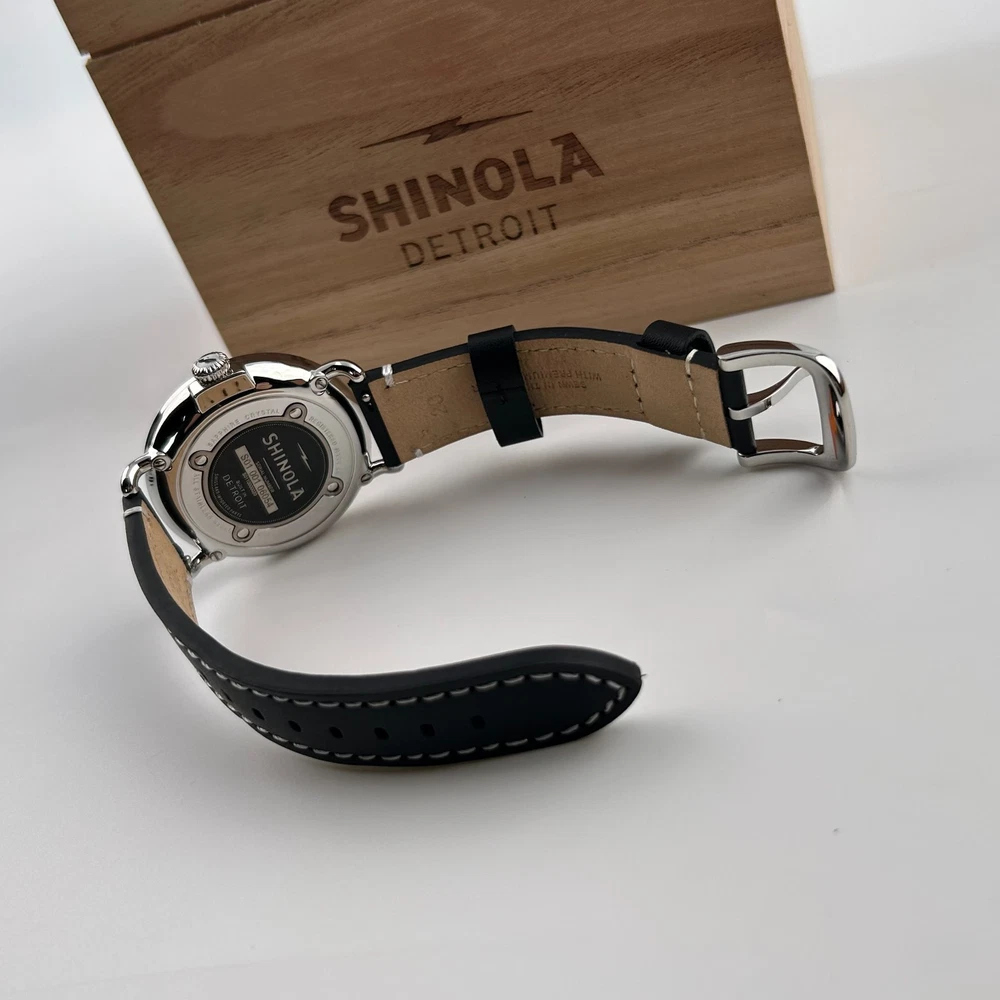 Watch details: Brand: Shinola Collection:Runwell Crystal: Double-domed sapphire Dial Color:Black Type: Argonite 1069 Quartz Water Resistance: 5 ATM Crown Construction: Screw-down Case Material: Stainless Steel Case Diameter:41mm Back:Signature Iconic Caseback Plate with Laser-Etched Serial Number Band Width: 20mm Band Color: Black Thickness: 10.1mm Band Material:Leather Plating:Polished PVD Gold THE ARGONITE 1069 The first movement we learned to build and the one that still exudes an understated power. The high-accuracy quartz movement—hand-assembled in Detroit with Swiss and other imported parts—drives the hours, minutes and sub-second with precision. POLISHED STAINLESS STEEL CASE This polished stainless steel case features a classic pumpkin crown and double-domed sapphire crystal. Sapphire is second only to the diamond in hardness, helping protect the watch from scratches. COLLEGIATE BLUE DIAL The face of fandom, this eye-catching dial pairs collegiate blue with maize details for a look that’s tough to beat. PREMIUM LEATHER STRAP IN NATURAL Smooth and sophisticated, this premium leather strap in natural is the perfect complement to this Runwell. It's also removable, making the timepiece customizable with the purchase of an additional strap. Shinola leather straps are cut and sewn in America. A WOODEN BOX TO TREASURE Built from premium wood, every Shinola watch box is designed to last for generations. Fast shipping via usps, ups, fedex Orders will ship within 1-2 days (excluding weekends and holidays) Please contact me if you have any questions, and I will reply within 24 hours.