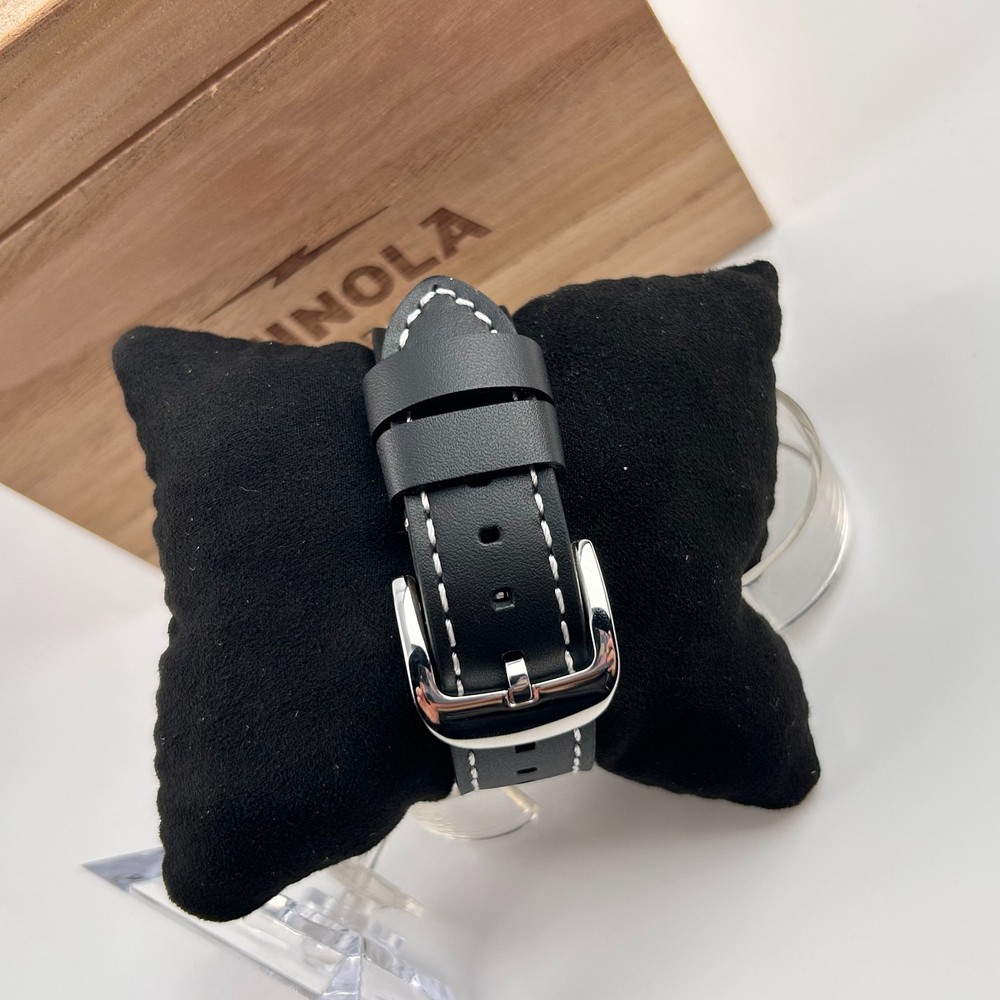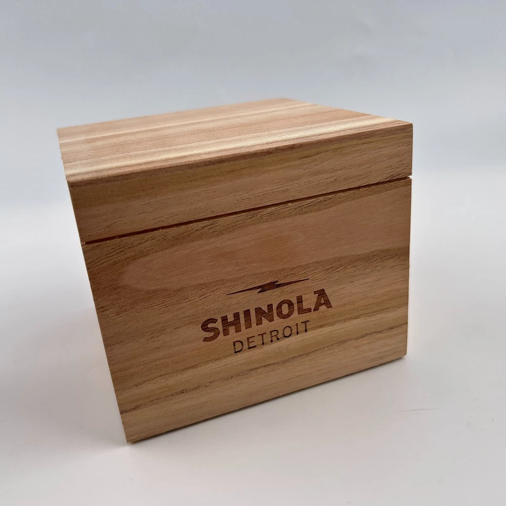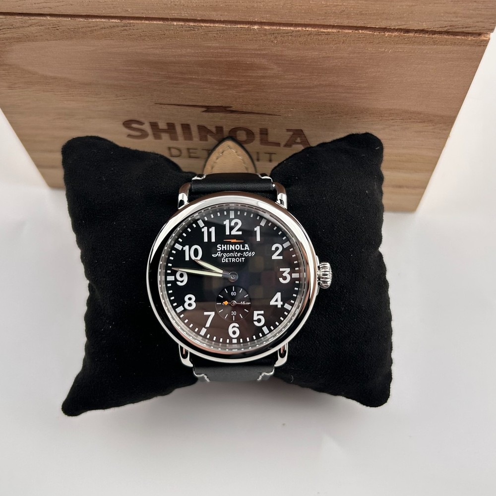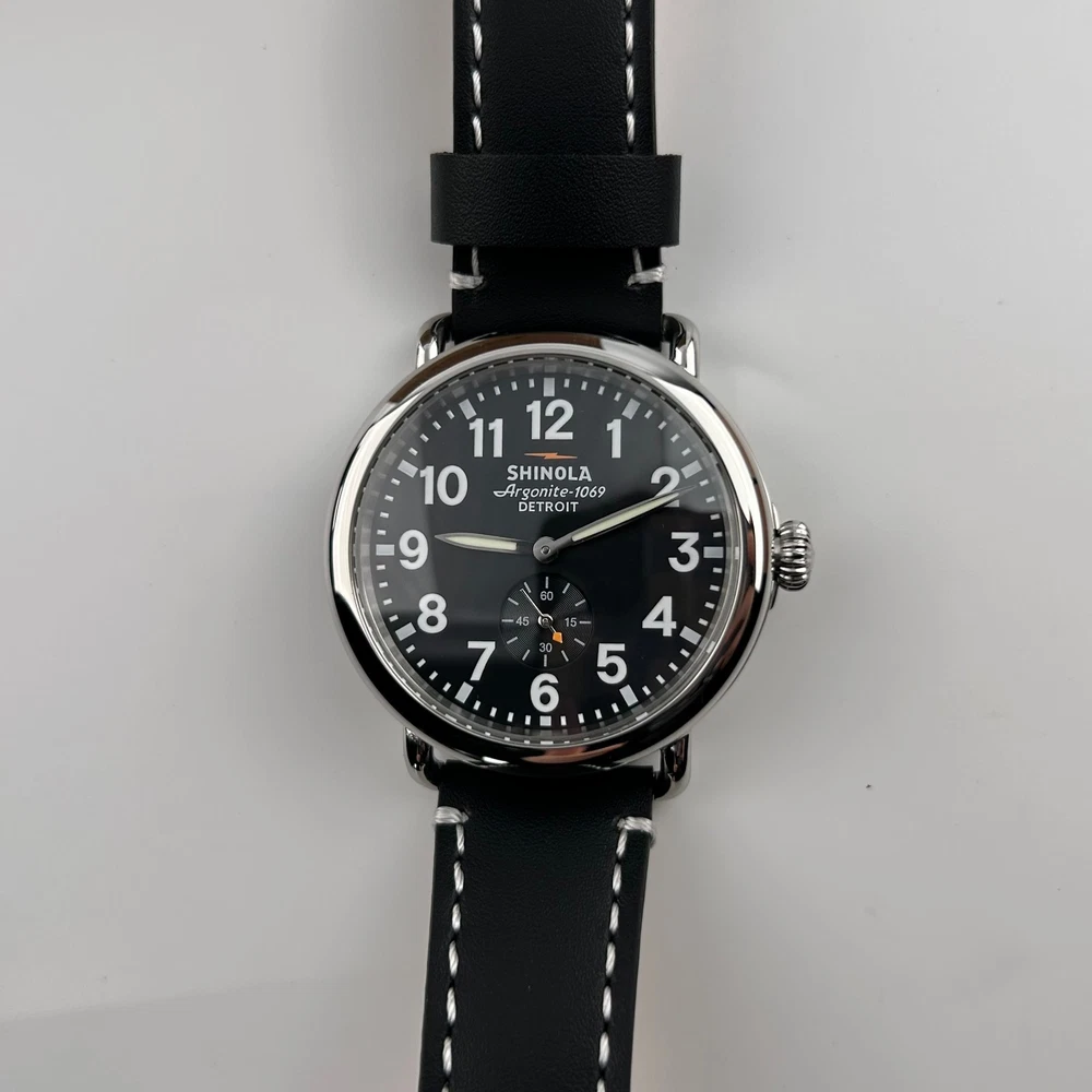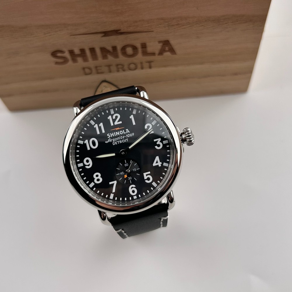 Watch details: Brand: Shinola Collection:Runwell Crystal: Double-domed sapphire Dial Color:Black Type: Argonite 1069 Quartz Water Resistance: 5 ATM Crown Construction: Screw-down Case Material: Stainless Steel Case Diameter:41mm Back:Signature Iconic Caseback Plate with Laser-Etched Serial Number Band Width: 20mm Band Color: Black Thickness: 10.1mm Band Material:Leather Plating:Polished PVD Gold THE ARGONITE 1069 The first movement we learned to build and the one that still exudes an understated power. The high-accuracy quartz movement—hand-assembled in Detroit with Swiss and other imported parts—drives the hours, minutes and sub-second with precision. POLISHED STAINLESS STEEL CASE This polished stainless steel case features a classic pumpkin crown and double-domed sapphire crystal. Sapphire is second only to the diamond in hardness, helping protect the watch from scratches. COLLEGIATE BLUE DIAL The face of fandom, this eye-catching dial pairs collegiate blue with maize details for a look that’s tough to beat. PREMIUM LEATHER STRAP IN NATURAL Smooth and sophisticated, this premium leather strap in natural is the perfect complement to this Runwell. It's also removable, making the timepiece customizable with the purchase of an additional strap. Shinola leather straps are cut and sewn in America. A WOODEN BOX TO TREASURE Built from premium wood, every Shinola watch box is designed to last for generations. Fast shipping via usps, ups, fedex Orders will ship within 1-2 days (excluding weekends and holidays) Please contact me if you have any questions, and I will reply within 24 hours.