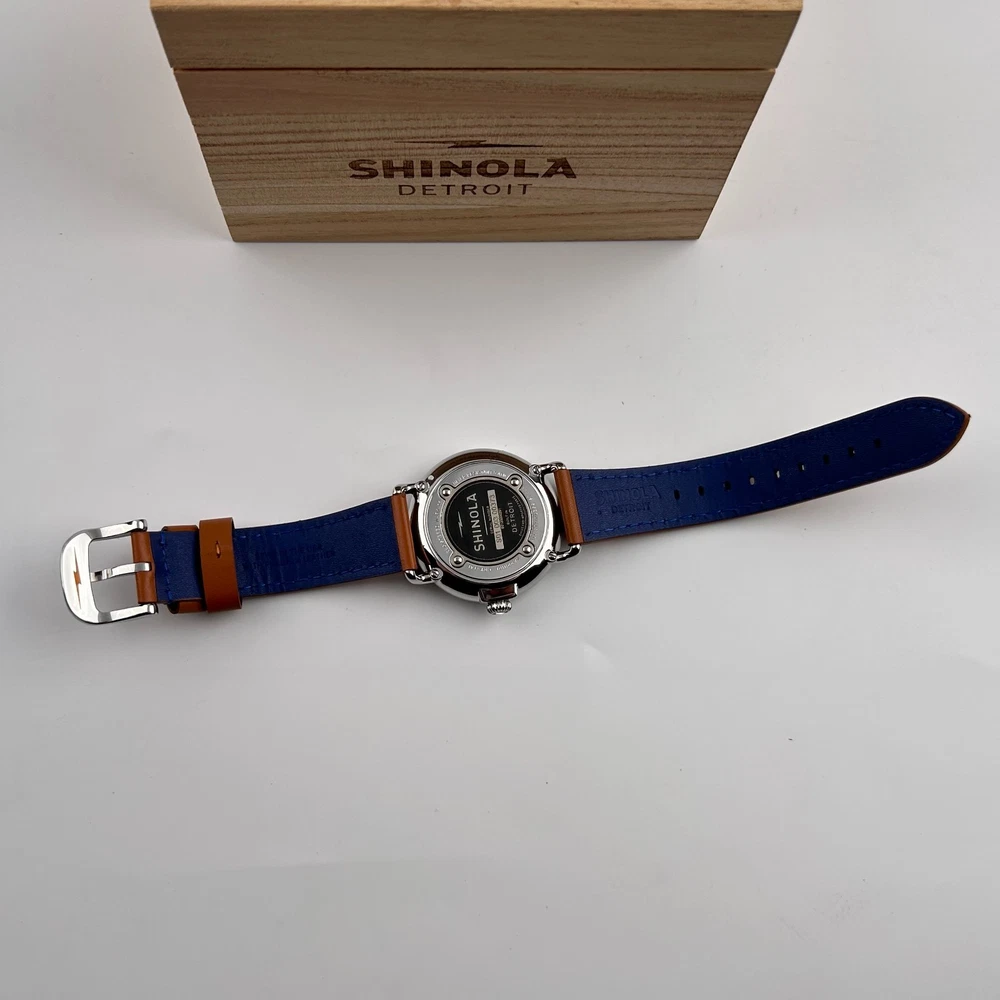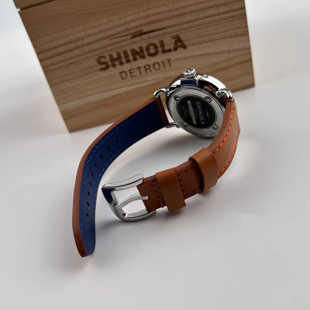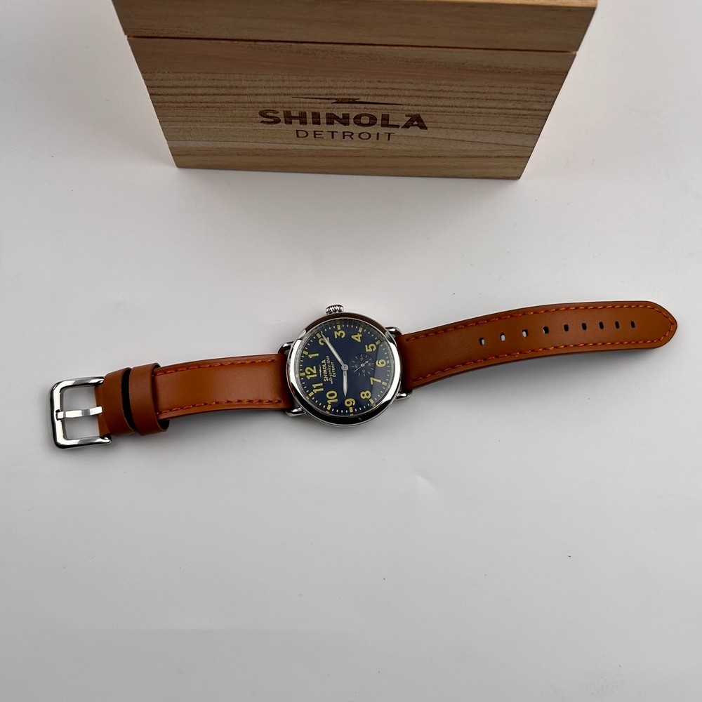 Watch details: Brand: Shinola Collection:Runwell Crystal: Double-domed sapphire Dial Color:Blue/Silver Type: Argonite 1069 Quartz Water Resistance: 5 ATM Crown Construction: Screw-down Case Material: Stainless Steel Case Diameter:47 mm Back:Signature Iconic Caseback Plate with Laser-Etched Serial Number Band Width: 24mm Band Color: Brown Thickness: 11mm Band Material:Leather Plating:Polished PVD Gold THE ARGONITE 1069 The first movement we learned to build and the one that still exudes an understated power. The high-accuracy quartz movement—hand-assembled in Detroit with Swiss and other imported parts—drives the hours, minutes and sub-second with precision. POLISHED STAINLESS STEEL CASE This polished stainless steel case features a classic pumpkin crown and double-domed sapphire crystal. Sapphire is second only to the diamond in hardness, helping protect the watch from scratches. COLLEGIATE BLUE DIAL The face of fandom, this eye-catching dial pairs collegiate blue with maize details for a look that’s tough to beat. PREMIUM LEATHER STRAP IN NATURAL Smooth and sophisticated, this premium leather strap in natural is the perfect complement to this Runwell. It's also removable, making the timepiece customizable with the purchase of an additional strap. Shinola leather straps are cut and sewn in America. A WOODEN BOX TO TREASURE Built from premium wood, every Shinola watch box is designed to last for generations. Fast shipping via usps, ups, fedex Orders will ship within 1-2 days (excluding weekends and holidays) Please contact me if you have any questions, and I will reply within 24 hours.