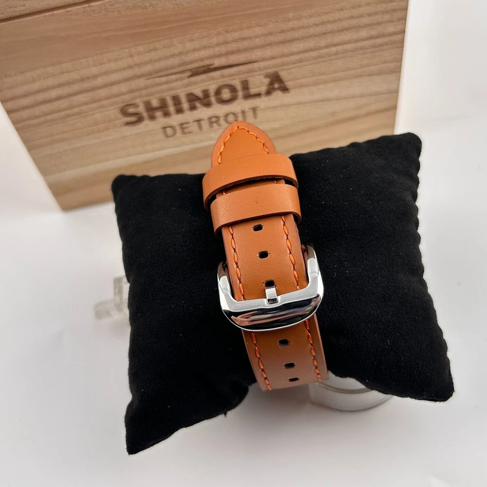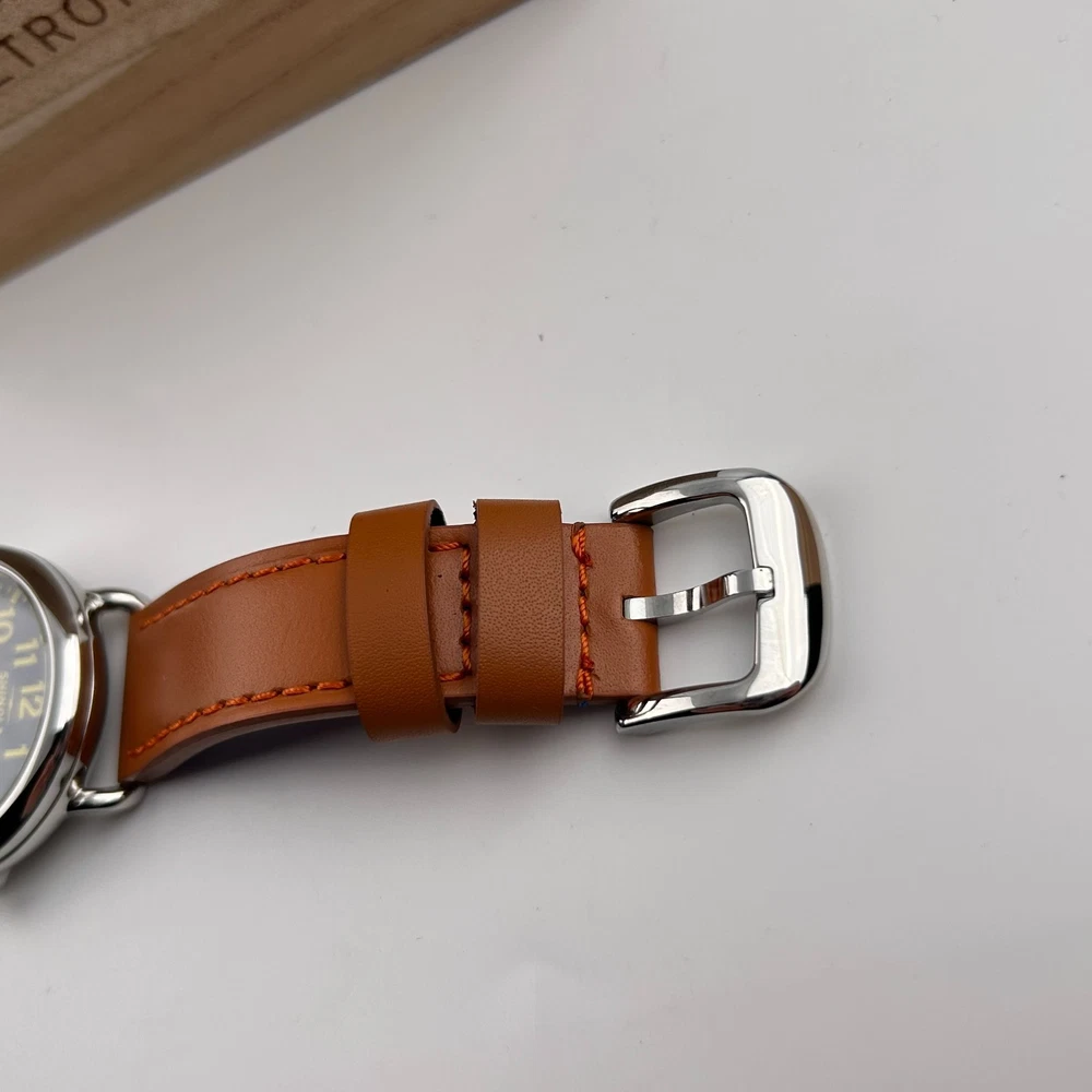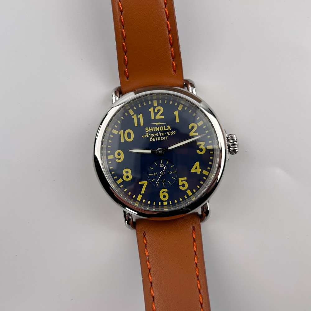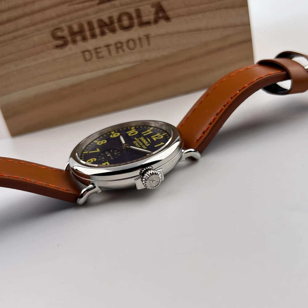 Watch details: Brand: Shinola Collection:Runwell Crystal: Double-domed sapphire Dial Color:Blue/Silver Type: Argonite 1069 Quartz Water Resistance: 5 ATM Crown Construction: Screw-down Case Material: Stainless Steel Case Diameter:47 mm Back:Signature Iconic Caseback Plate with Laser-Etched Serial Number Band Width: 24mm Band Color: Brown Thickness: 11mm Band Material:Leather Plating:Polished PVD Gold THE ARGONITE 1069 The first movement we learned to build and the one that still exudes an understated power. The high-accuracy quartz movement—hand-assembled in Detroit with Swiss and other imported parts—drives the hours, minutes and sub-second with precision. POLISHED STAINLESS STEEL CASE This polished stainless steel case features a classic pumpkin crown and double-domed sapphire crystal. Sapphire is second only to the diamond in hardness, helping protect the watch from scratches. COLLEGIATE BLUE DIAL The face of fandom, this eye-catching dial pairs collegiate blue with maize details for a look that’s tough to beat. PREMIUM LEATHER STRAP IN NATURAL Smooth and sophisticated, this premium leather strap in natural is the perfect complement to this Runwell. It's also removable, making the timepiece customizable with the purchase of an additional strap. Shinola leather straps are cut and sewn in America. A WOODEN BOX TO TREASURE Built from premium wood, every Shinola watch box is designed to last for generations. Fast shipping via usps, ups, fedex Orders will ship within 1-2 days (excluding weekends and holidays) Please contact me if you have any questions, and I will reply within 24 hours.