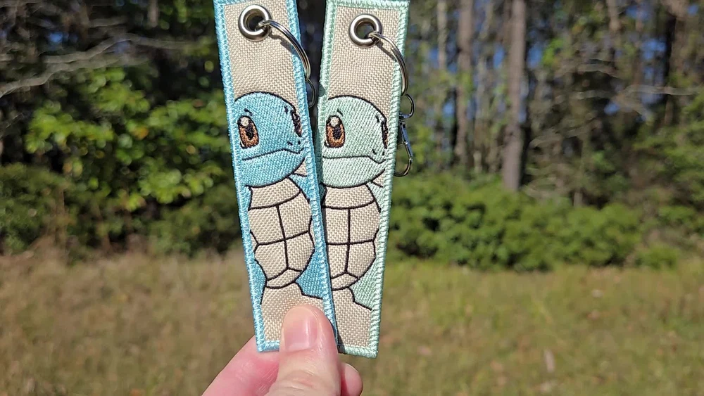 This is a Shiny Squirtle Jet Tag Keychain that I machine embroidered into waterproof canvas, it's perfect for accessorizing anything from your keyring to a lanyard or a backpack! This tag is made from waterproof canvas with a different design embroidered into the front and back. I also offer the option to have a custom name on the back of the Tag! The dimensions of this tag measure roughly 5x1in. If there is a certain character that you're interested in, please feel free to message me!