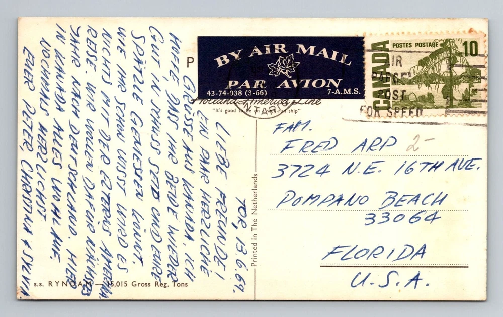Ship - Holland America Line, RYNDAM Cruise Ship, Vintage c1969 Souvenir Postcard