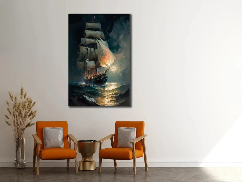 Ship In Night Sea Waves & Sky Painting Unframed Canvas Print Australian Wall Art