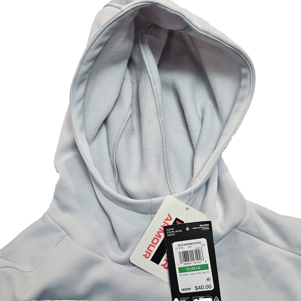 This Under Armour boys' hoodie in size L features a big logo on the front, making it perfect for casual occasions, travel, activewear, or work. Made from cozy fleece fabric with a pullover design and crew neckline, it offers a lightweight and breathable option for the winter, fall, and spring seasons. With features like a hood, stretch material, and pockets, this hoodie is easy to care for and suitable for various activities like school, golf, hiking, fishing, or running. Perfect for adding a sporty touch to any young boy's wardrobe.